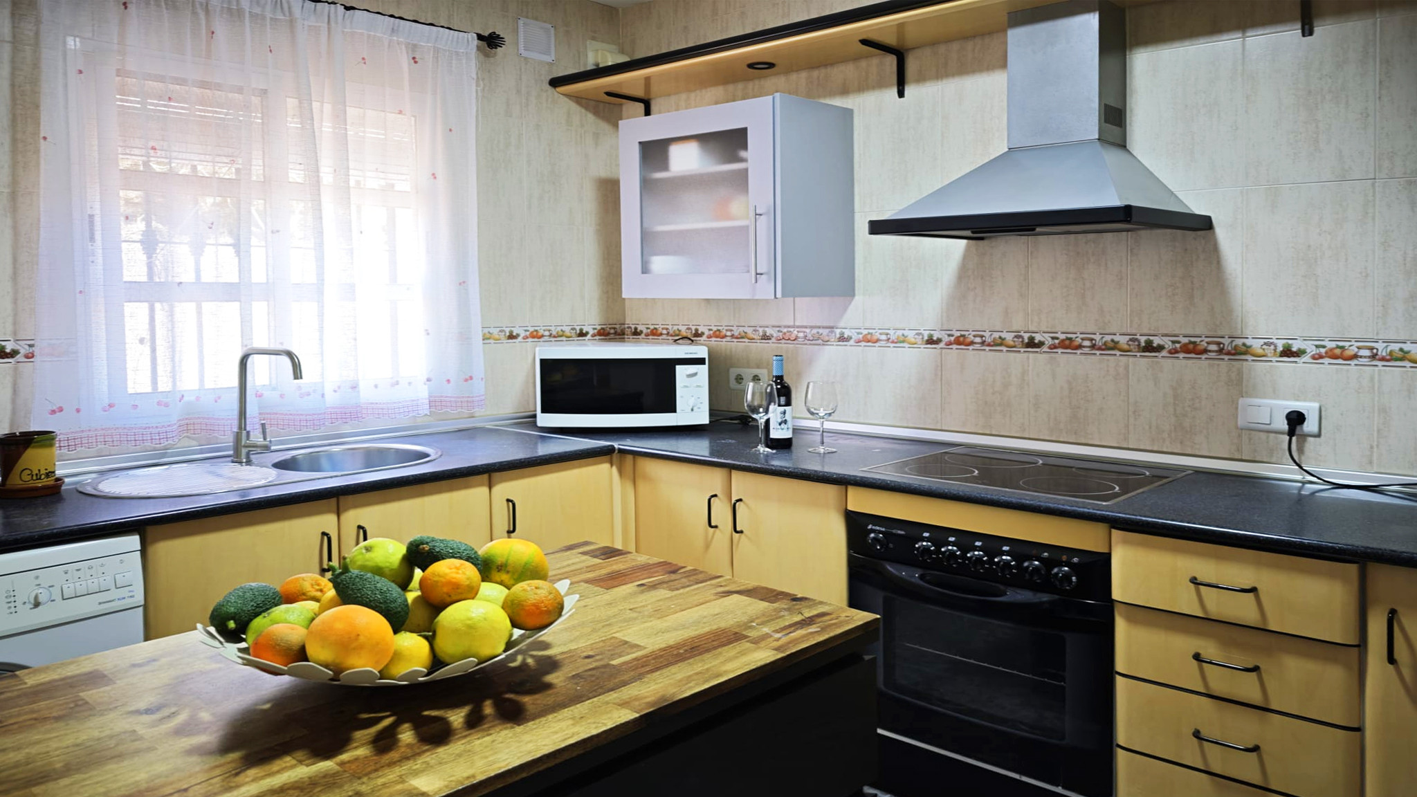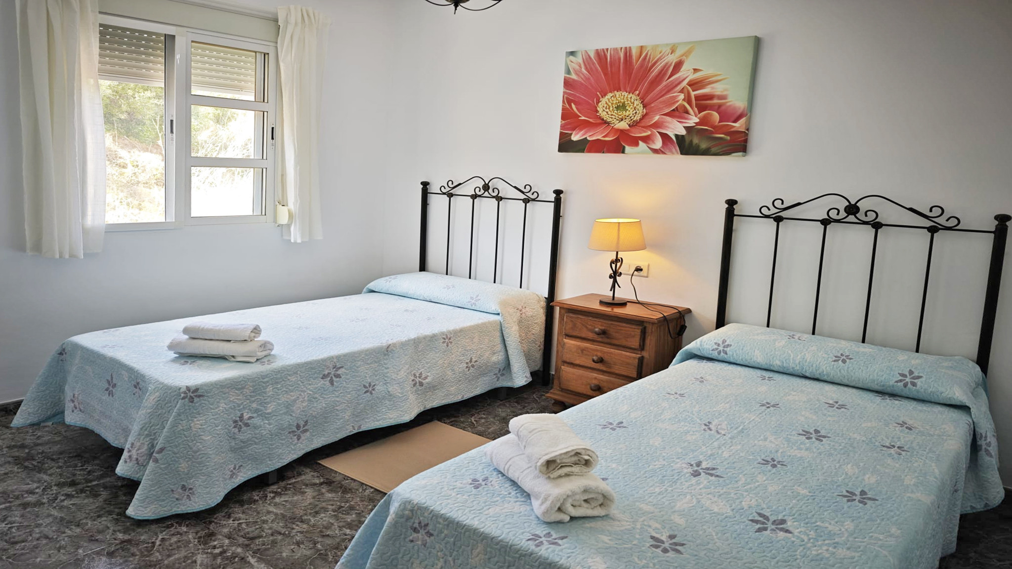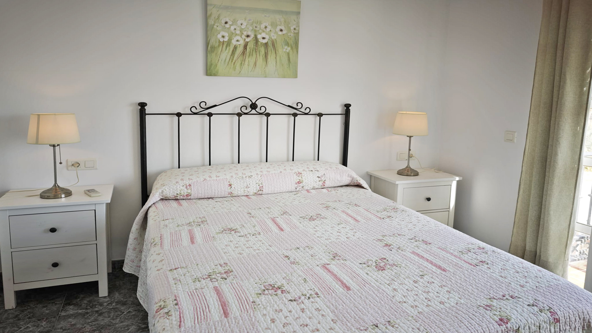 Das Haus erstreckt sich über zwei Hauptetagen sowie eine große Dachterrasse und verfügt über insgesamt drei Terrassen, ideal, um die Sonne und das mediterrane Klima zu genießen. Im Erdgeschoss befinden sich eine komplett ausgestattete separate Küche, ein helles Wohnzimmer mit Sofa, Esstisch, TV und direktem Zugang zu einer der Terrassen sowie ein Gäste-WC. Im ersten Stock gibt es zwei Schlafzimmer: eines mit Doppelbett und Klimaanlage, das andere mit zwei Einzelbetten. Beide teilen sich ein komplettes Badezimmer mit Badewanne, Dusche, Waschbecken und WC. Von dieser Etage aus hat man Zugang zu einer weiteren Terrasse mit schönem Blick auf die Landschaft.
