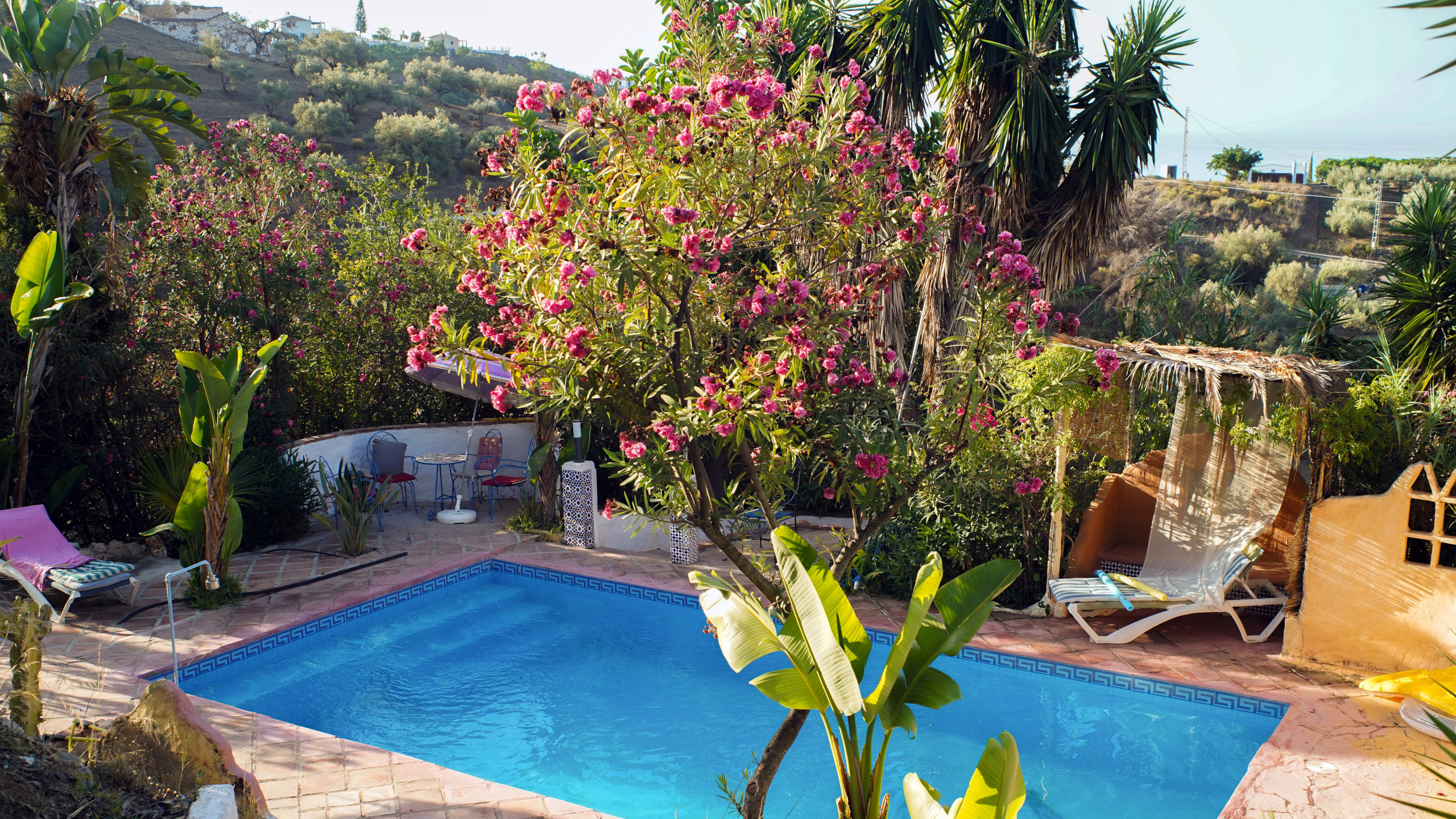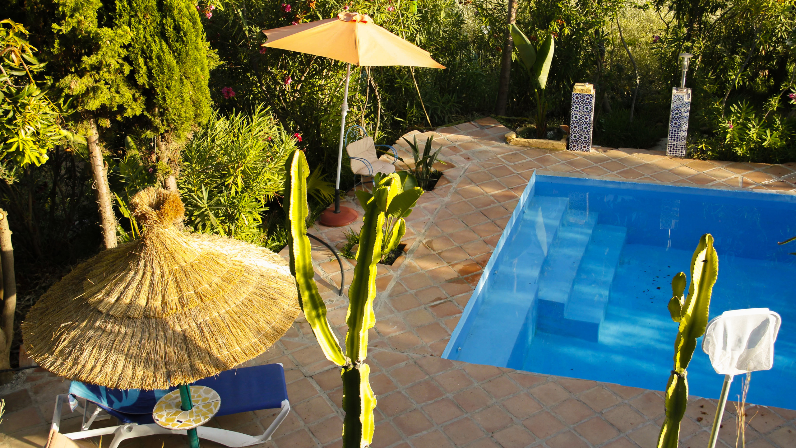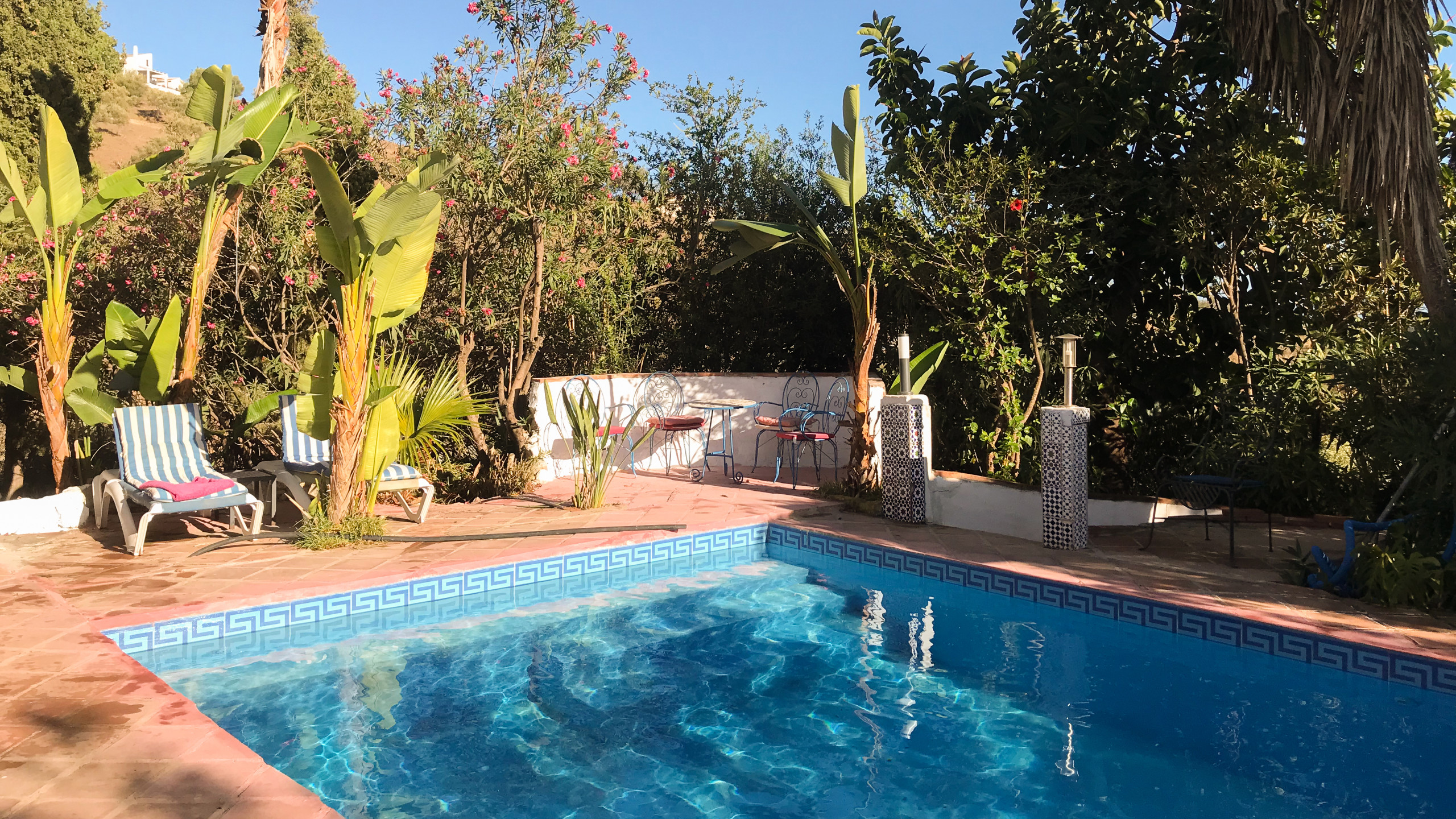 Die Anlage hat einen großen Swimmingpool (4x7,5 m lang und 1x1,5 m tief) mit Rasenfläche und einer hübschen Sonnenterrasse — zur Entspannung einladende Sonnenliegen sind vorhanden. Von hier aus gelangt man auch verhältnismäßig schnell zu den eindrucksvollen andalusischen Städten arabischen Ursprungs wie Granada, Sevilla und Cordoba. Und zu den Stränden von Nerja sind es nur 10 Minuten Autofahrt.