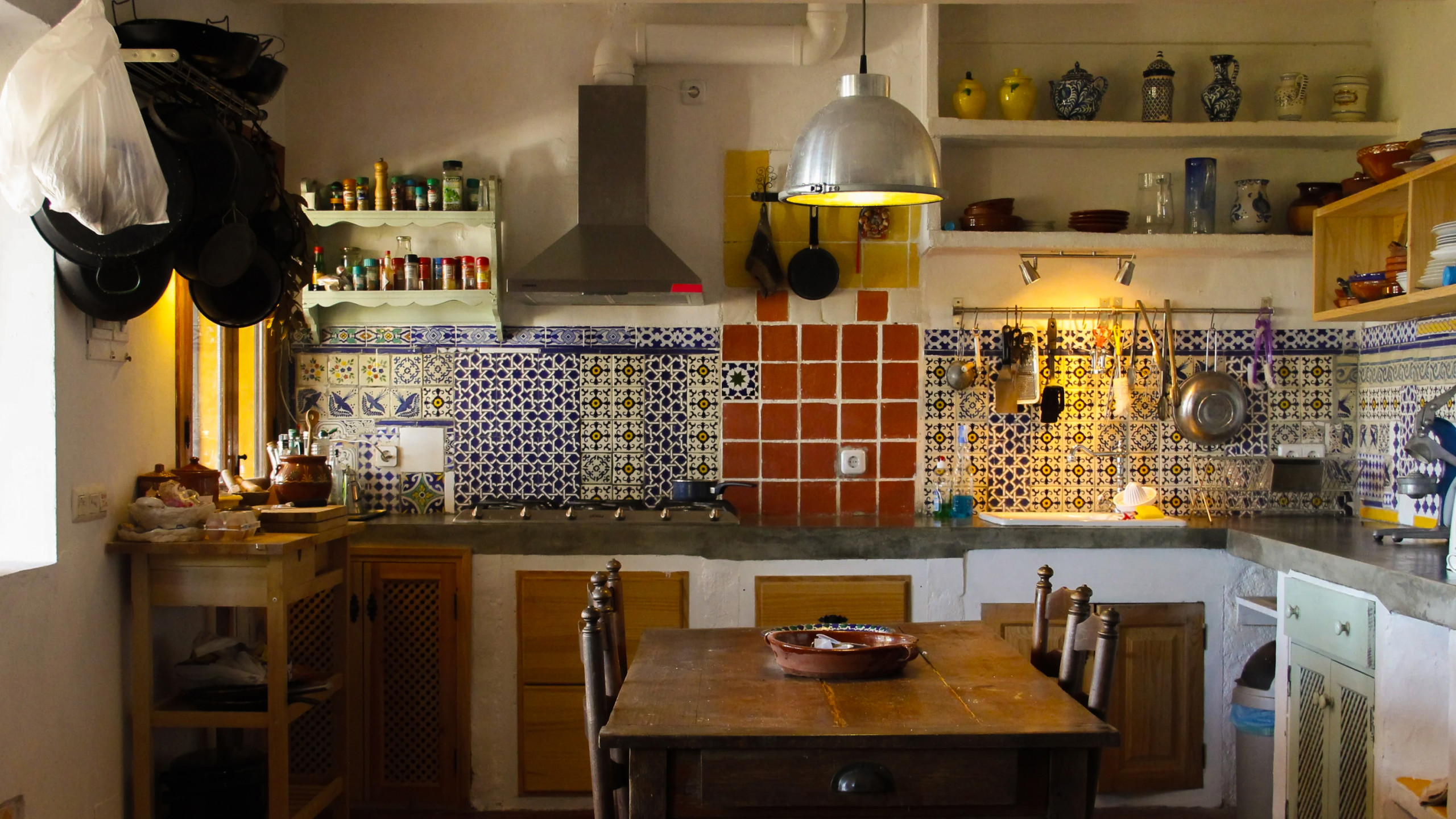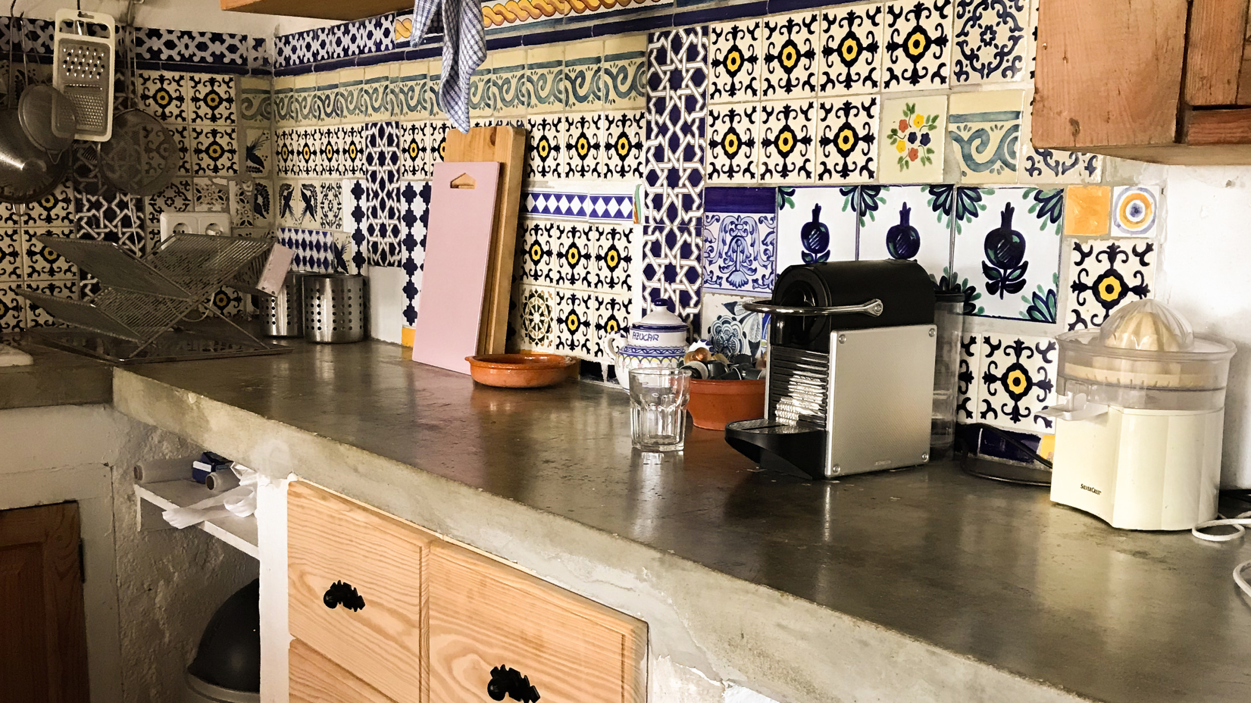 Am Eingang des Hauses befindet sich ein kleiner Salon in Erkerform mit Blick auf die Landschaft und das Meer am Horizont. Von dort gelangt man in eine große Küche, geschmackvoll im andalusischen Landhausstil eingerichtet und ausgestattet mit Kühlschrank/Gefrierschrank, Gasherd, Backofen, Waschmaschine und allen notwendigen Utensilien.
