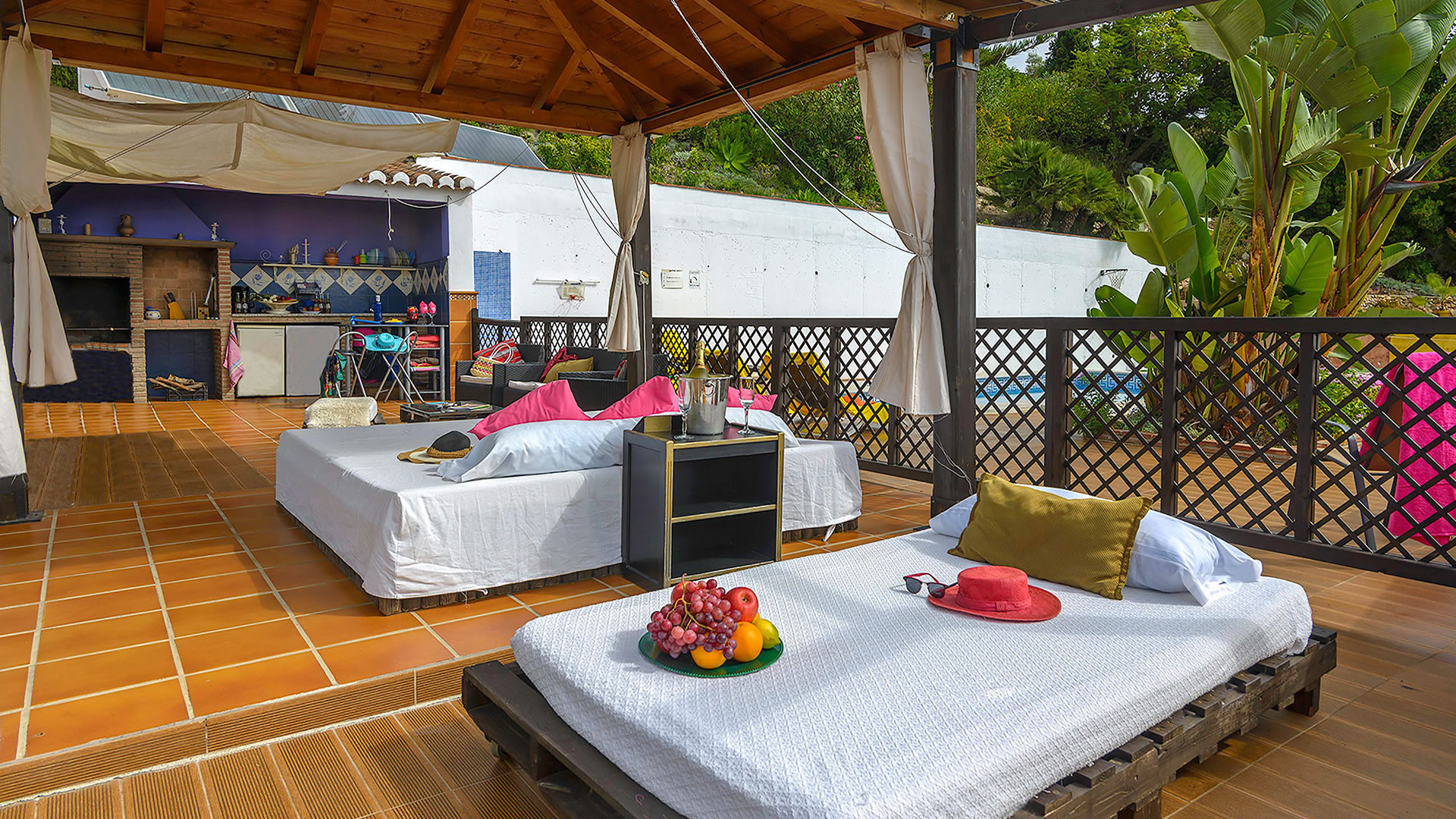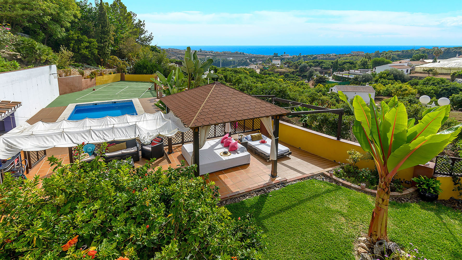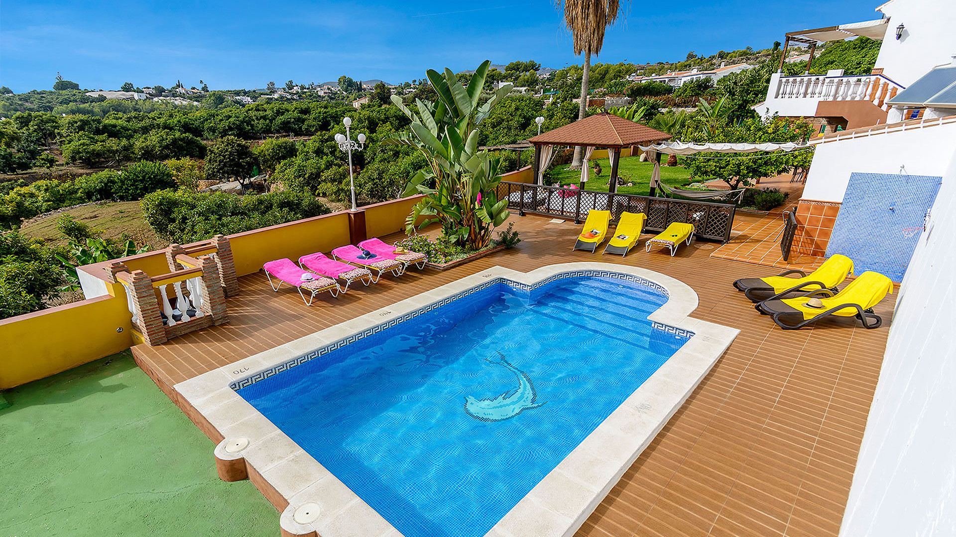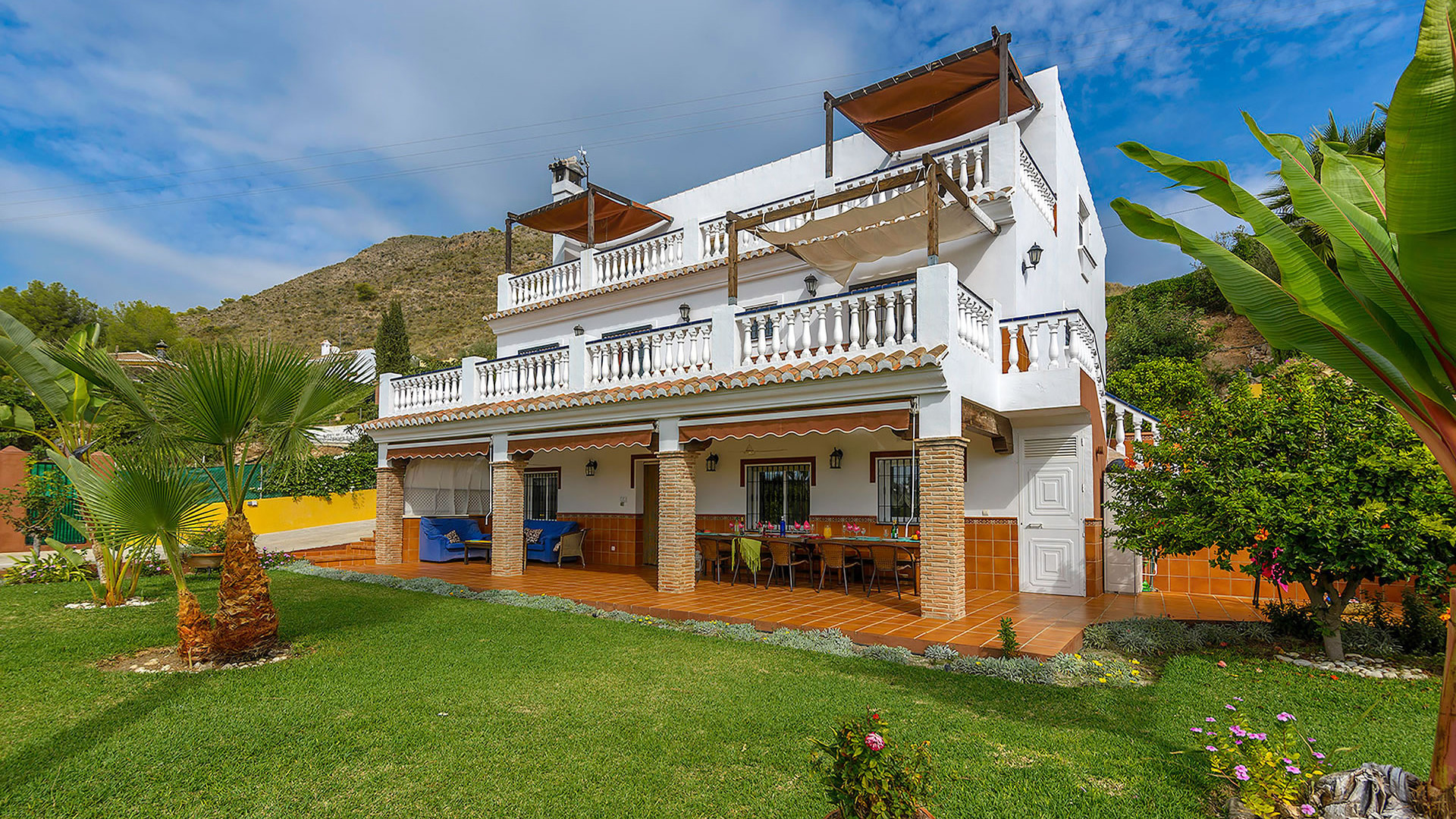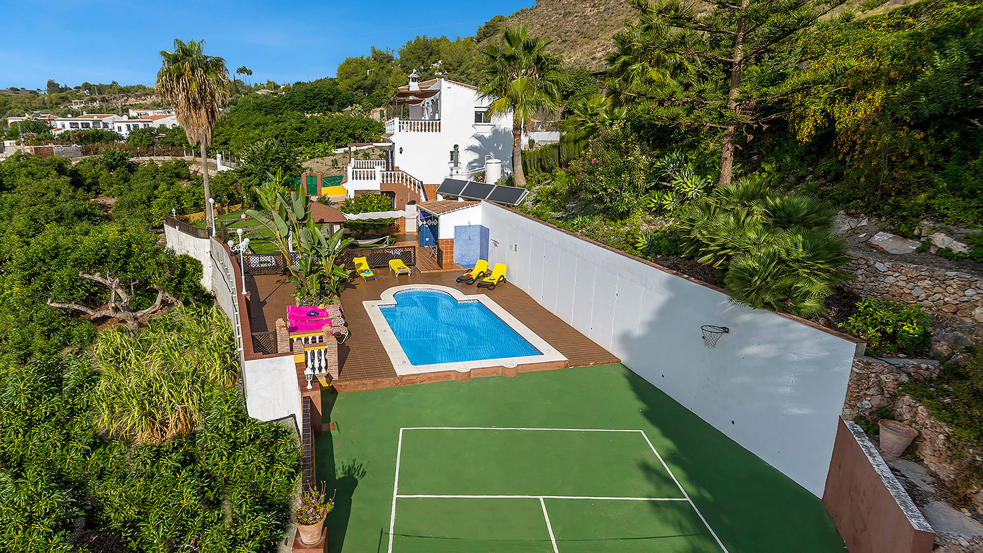 Die ländliche Lage dieses Anwesens, 2,5 km nordöstlich von Nerja, garantiert Ihnen Ruhe und Stille! Dennoch liegen die Supermärkte, Restaurants, Tapas-Bars und auch die Ausgeh-Möglichkeiten Nerjas nur einen Steinwurf entfernt und sind mit dem Auto schnell zu erreichen. Die umschlossenen Gärten am Haus sind Teil eines 2.600m2 großen privaten Landgutes. Sie beherbergen eine große Rasenfläche und ein eigenes Schwimmbecken von 9 x 5 Metern. Die schattige Veranda ist der ideale Ort für das Speisen unter freiem Himmel, oder um herrlich Siësta zu halten! Auch ein Grill ist vorhanden. Vom Ferienhaus und seinen prächtigen Gärten aus bietet sich Ihnen eine fantastische Aussicht über Nerja und die Umgebung bis ans Mittelmeer.