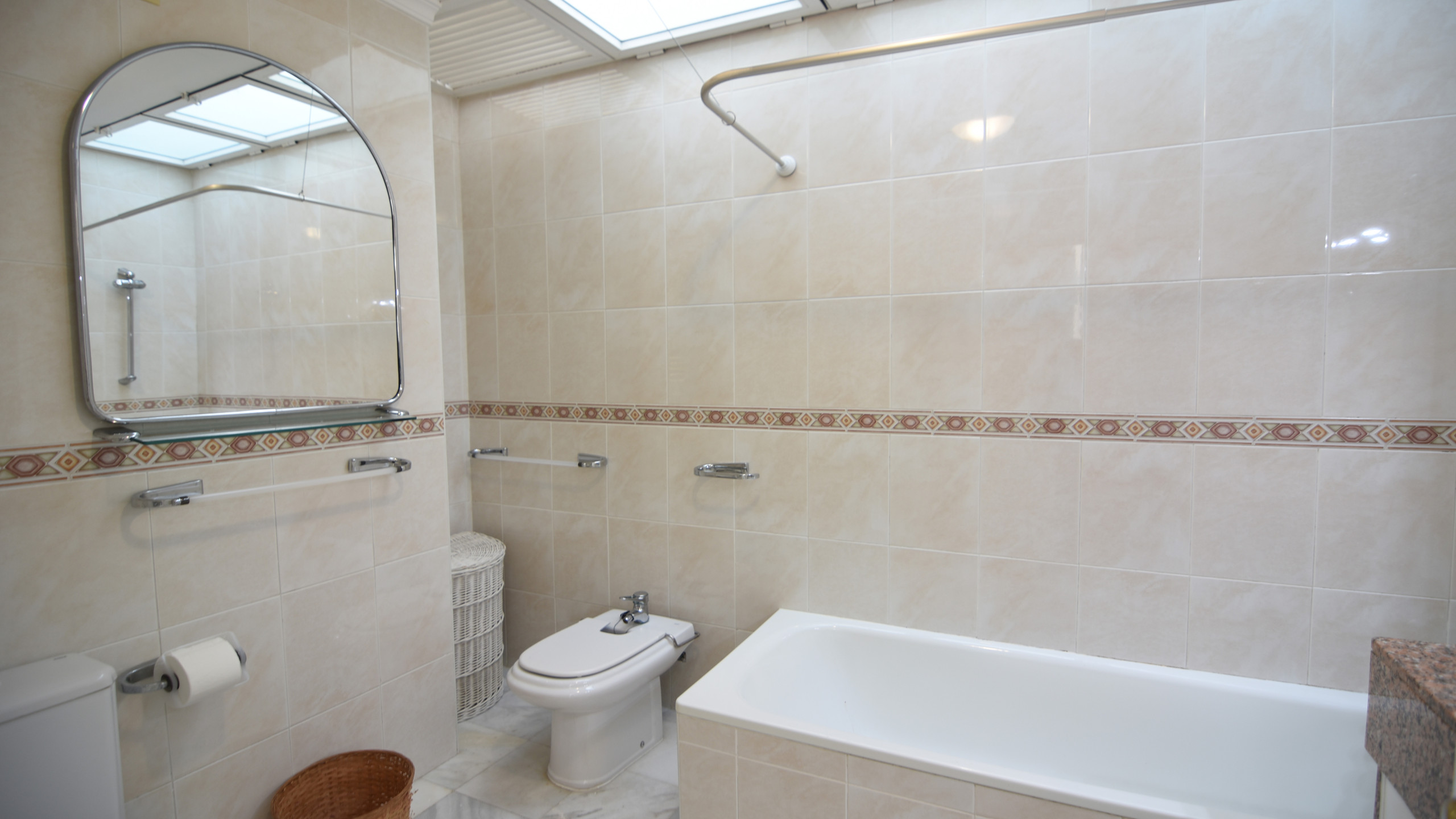 Auf der ersten Etage erwartet Sie ein geräumiges Doppelzimmer mit großer Sonnenterrasse, als auch ein weiteres Doppelzimmer mit zwei getrennten Betten. Das dritte Schlafzimmer auf dieser Etage ist sehr klein, ohne Stauraum, und mit einem Hochbett ausgestattet. Unserer Meinung nach ist dieses dritte Schlafzimmer deshalb eher für Kinder als für Erwachsene geeignet. Außerdem befindet sich auf dieser Etage ein vollständig ausgestattetes Badezimmer mit Duschvorrichtung über der Badewanne, Toilette, Bidet und Waschbecken.