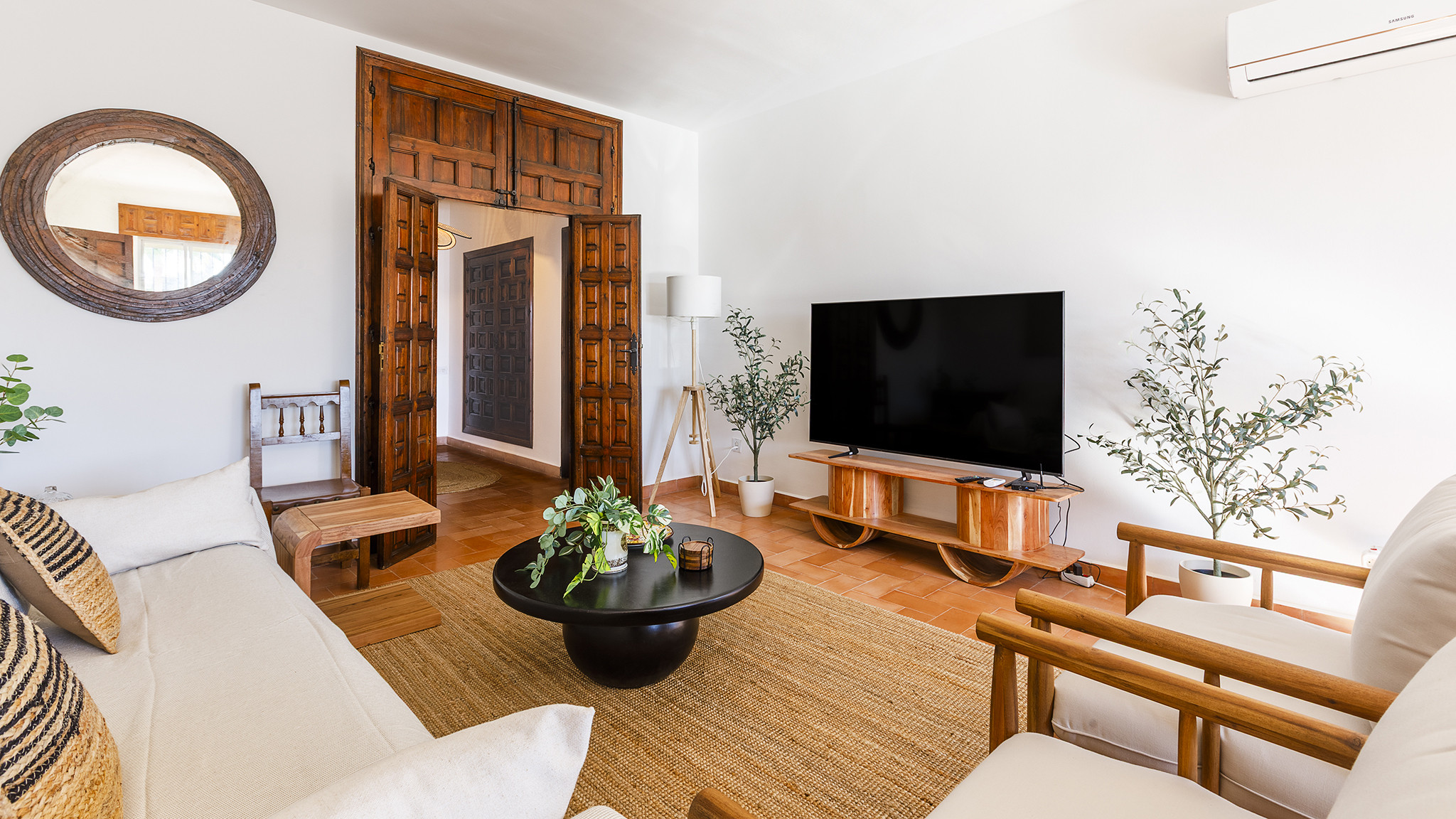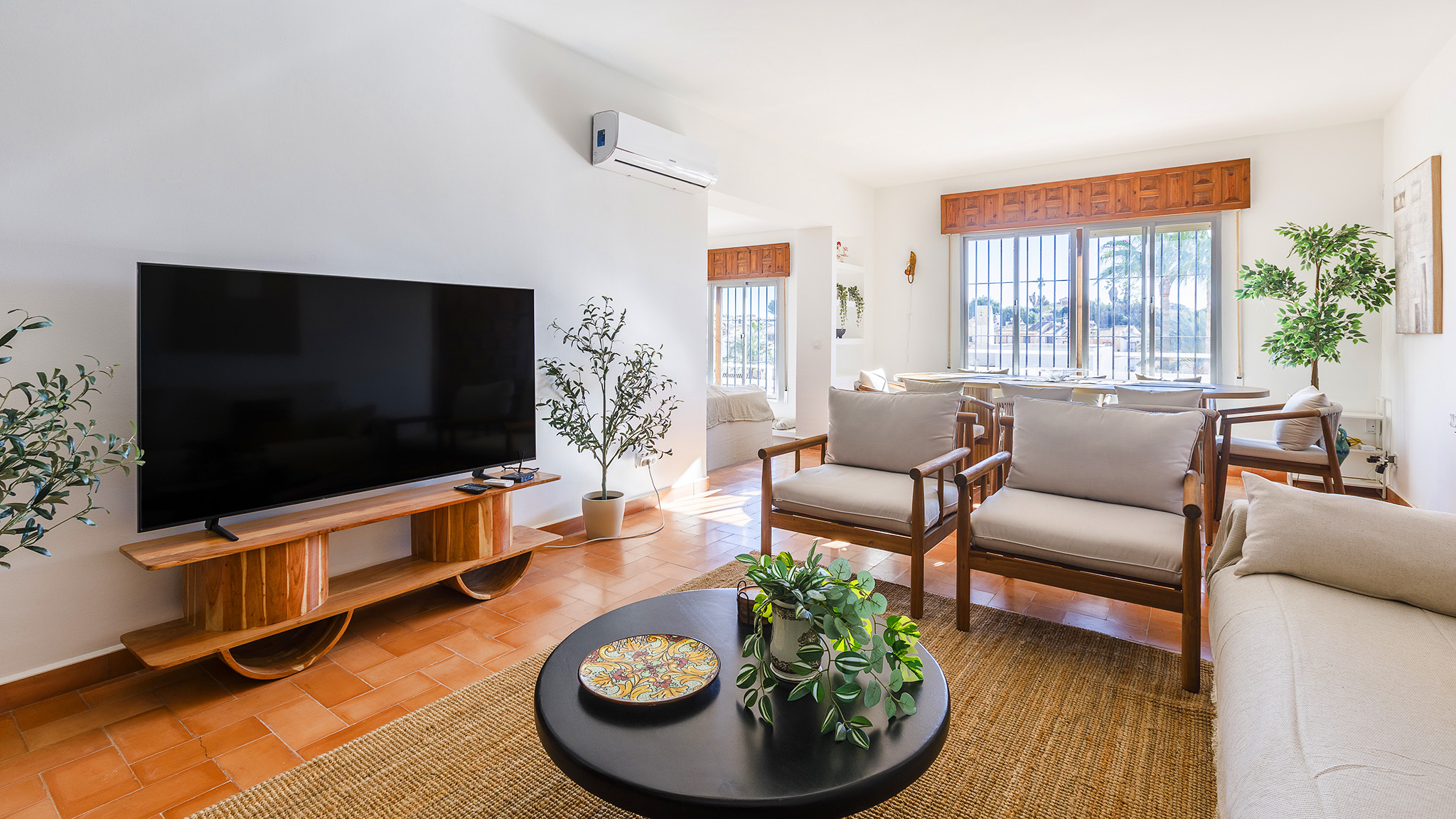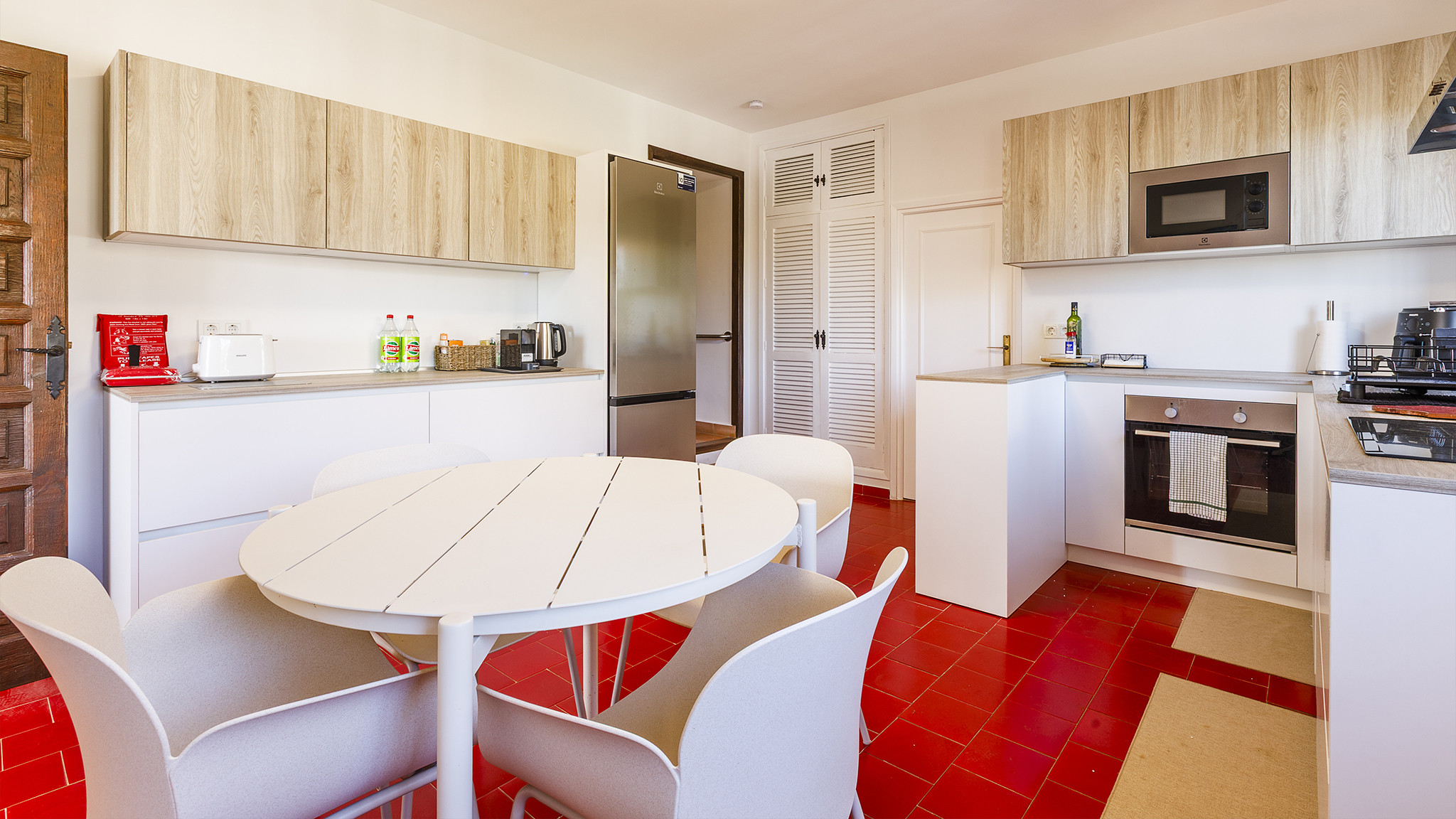 Im Inneren ist die Villa komfortabel eingerichtet. Das Wohnzimmer verfügt über bequeme Sofas und Sessel, einen Essbereich und einen Smart-TV mit internationalen Kanälen. Die unabhängige, voll ausgestattete Küche bietet alles, was für einen entspannten Urlaub benötigt wird.