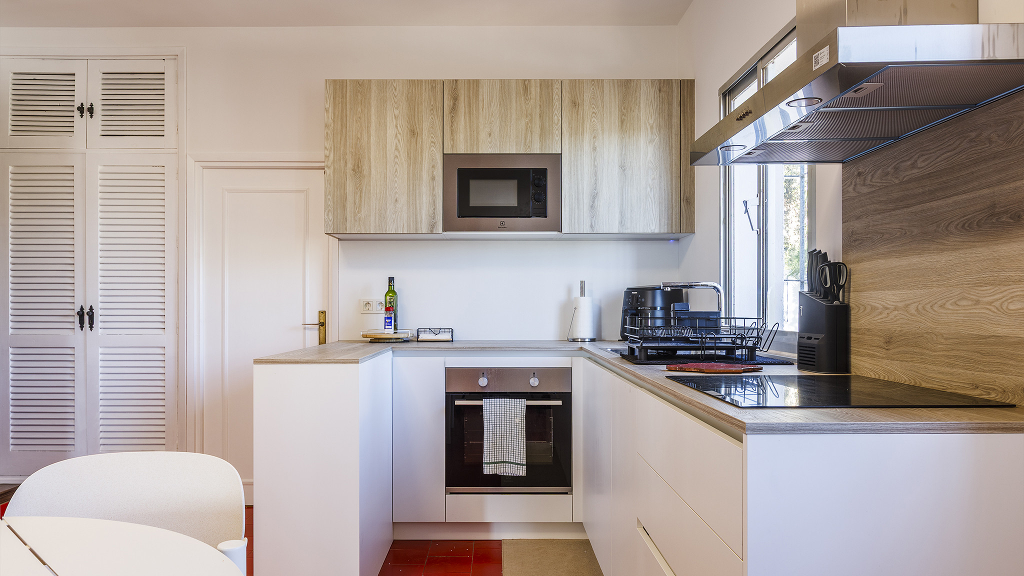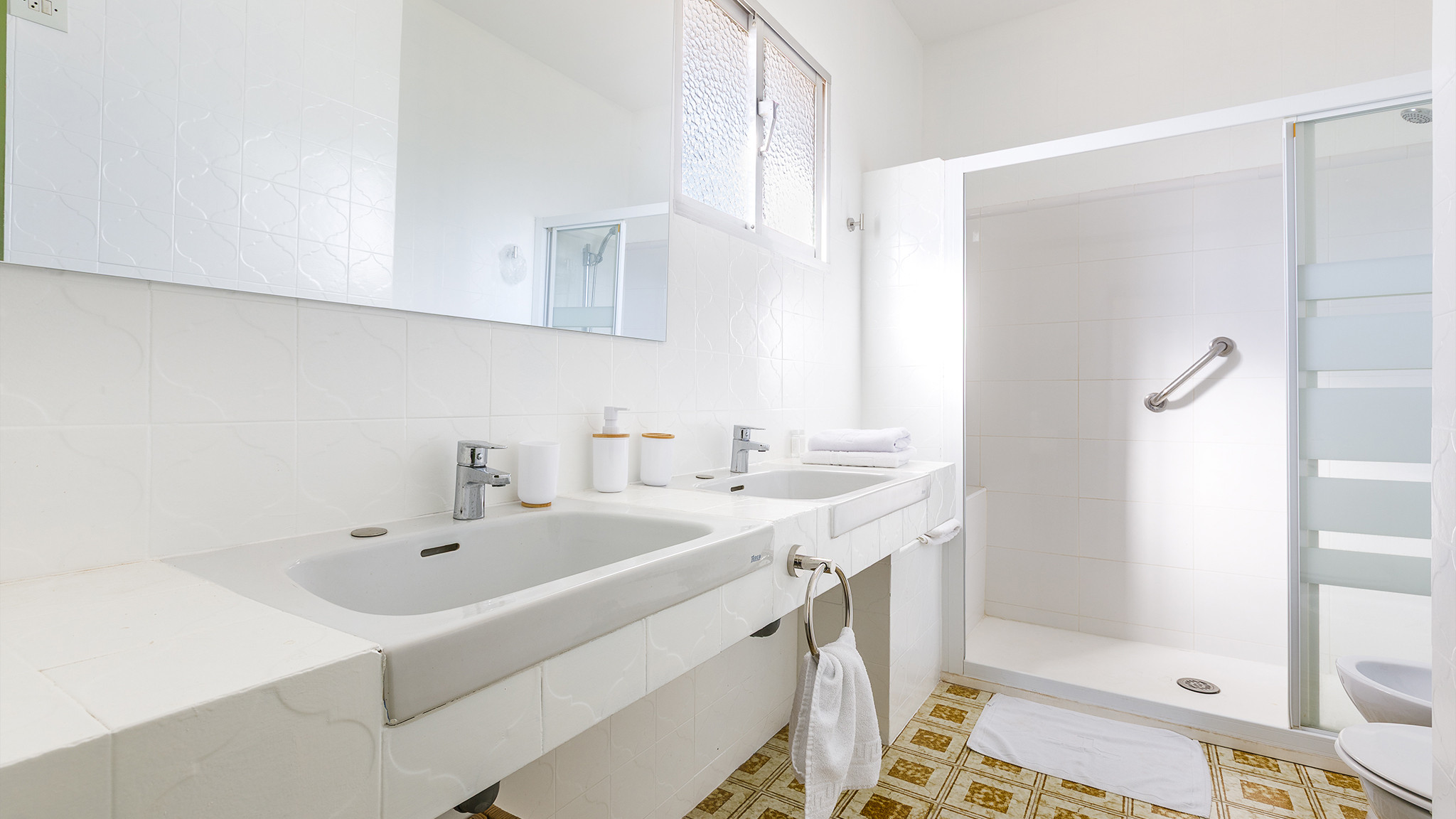 Ebenerdig haben Sie über das geräumige Wohn-/Esszimmer mit offener Küche Zugang zum Schwimmbecken. Die Küche auf dieser Etage eignet sich bestens dazu, hier die Vorbereitungen Grillsessions am Schwimmbecken zu treffen! Sie ist ausgestattet mit einem Kühl-/Gefrierschrank, einem vierflammigen Ceranfeld, Backofen, Waschmaschine und einem Frühstückstresen. Auf diesem Stockwerk finden Sie außerdem zwei Schlafzimmer (ein Doppel(-bett)schlafzimmer und ein Zimmer mit zwei Einzelbetten), sowie ein geräumiges Badezimmer mit Duschvorrichtung über der Badewanne, Toilette, einer weiteren Dusche, einem Waschbecken und einem Bidet.