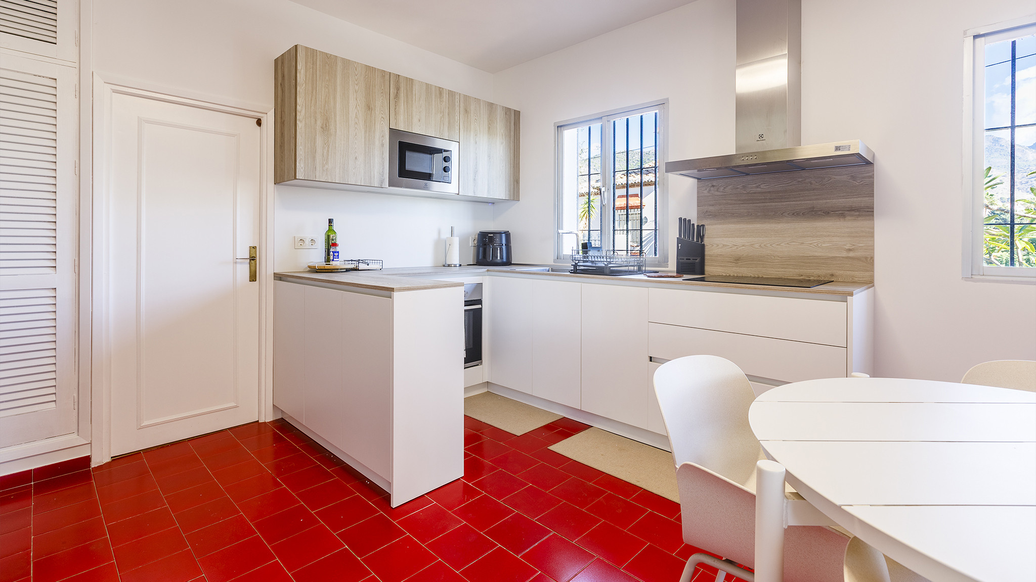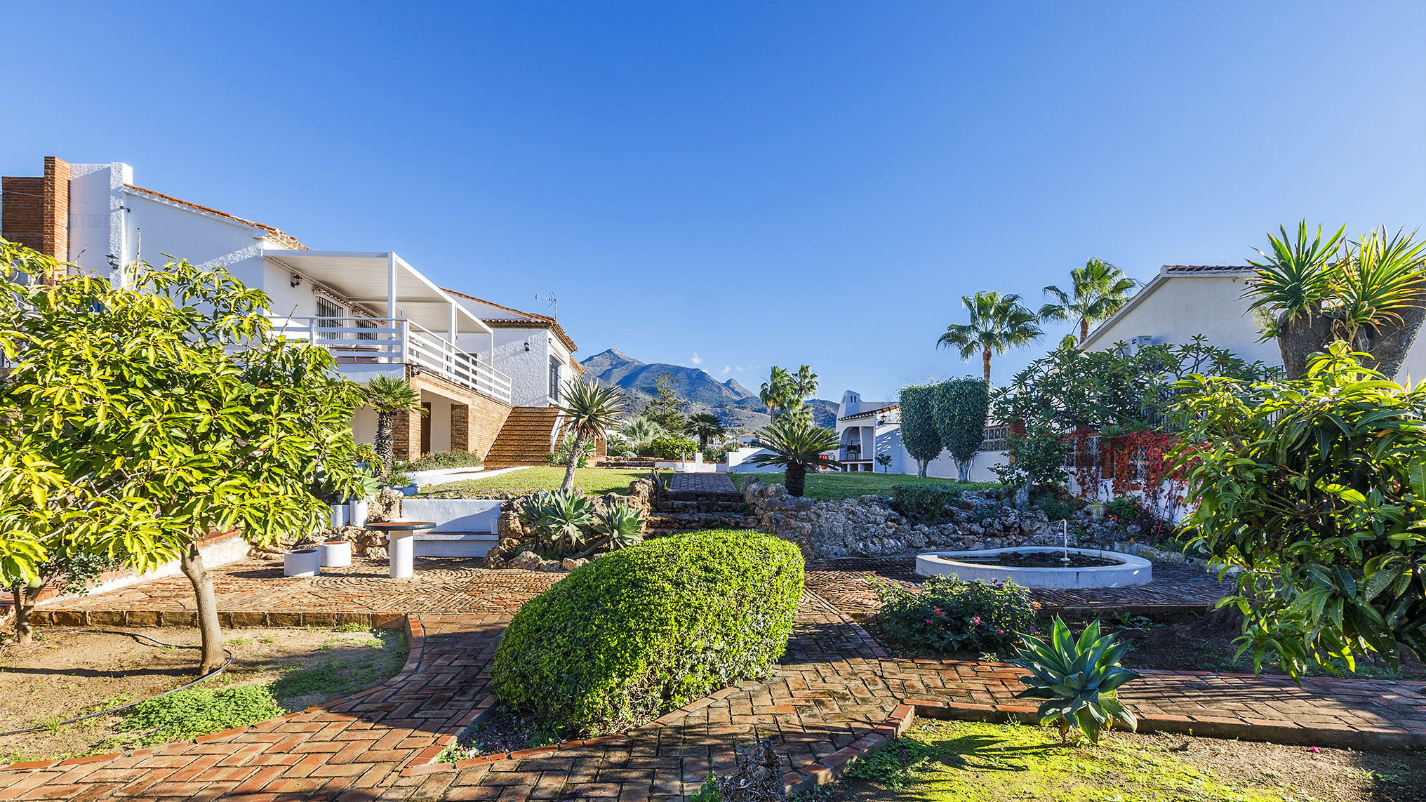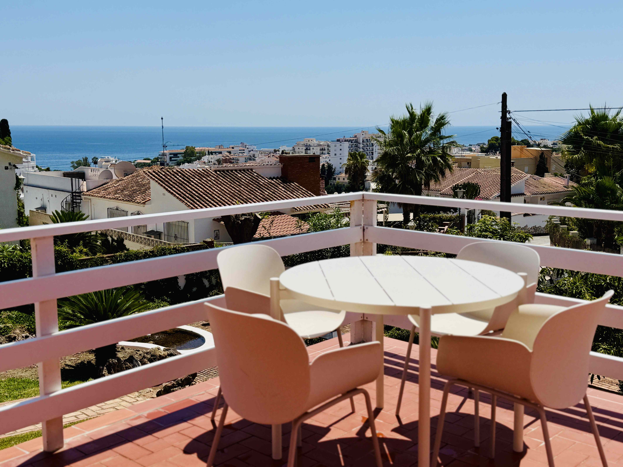 Die Umgebung von Exotica hält Balance zwischen Stadt und Land, das beste zweier Welten! Vom Schwimmbecken aus blicken Sie über die Landschaft unter Ihnen mit Avocado-, Oliven- und Zitrusbäumen. In Richtung Süden liegt Nerja, mit dem Mittelmeer im Hintergrund. Alles in allem ist dies ein sehr günstig gelegenes Domizil: 5 Autominuten vom Zentrum von Nerja (2,2 Kilometer) und den Stränden entfernt. Sie möchten das Auto zu Hause lassen? 800 Meter entfernt erwartet Sie ein Supermarkt (Lidl) und das Restaurant des Hotels Almazara liegt ebenfalls auf Laufabstand (1,2 Kilometer). Der Zugang zum Haus erfolgt über die Rasenfläche, der Eingang befindet sich im ersten Stockwerk. Das Schwimmbecken (7 Meter lang, 3 Meter breit; 1,40 Meter – 1,80 Meter tief) liegt auf ebenerdigem Niveau und ist umgeben von einer großen Terrasse mit Sonne UND Schatten. Liegestühle, Gartenmöbel und ein Grill stehen für Sie bereit. Die überdachte Terrasse mit Panoramasicht auf der ersten Etage ist der allerbeste Platz um draußen zu essen!