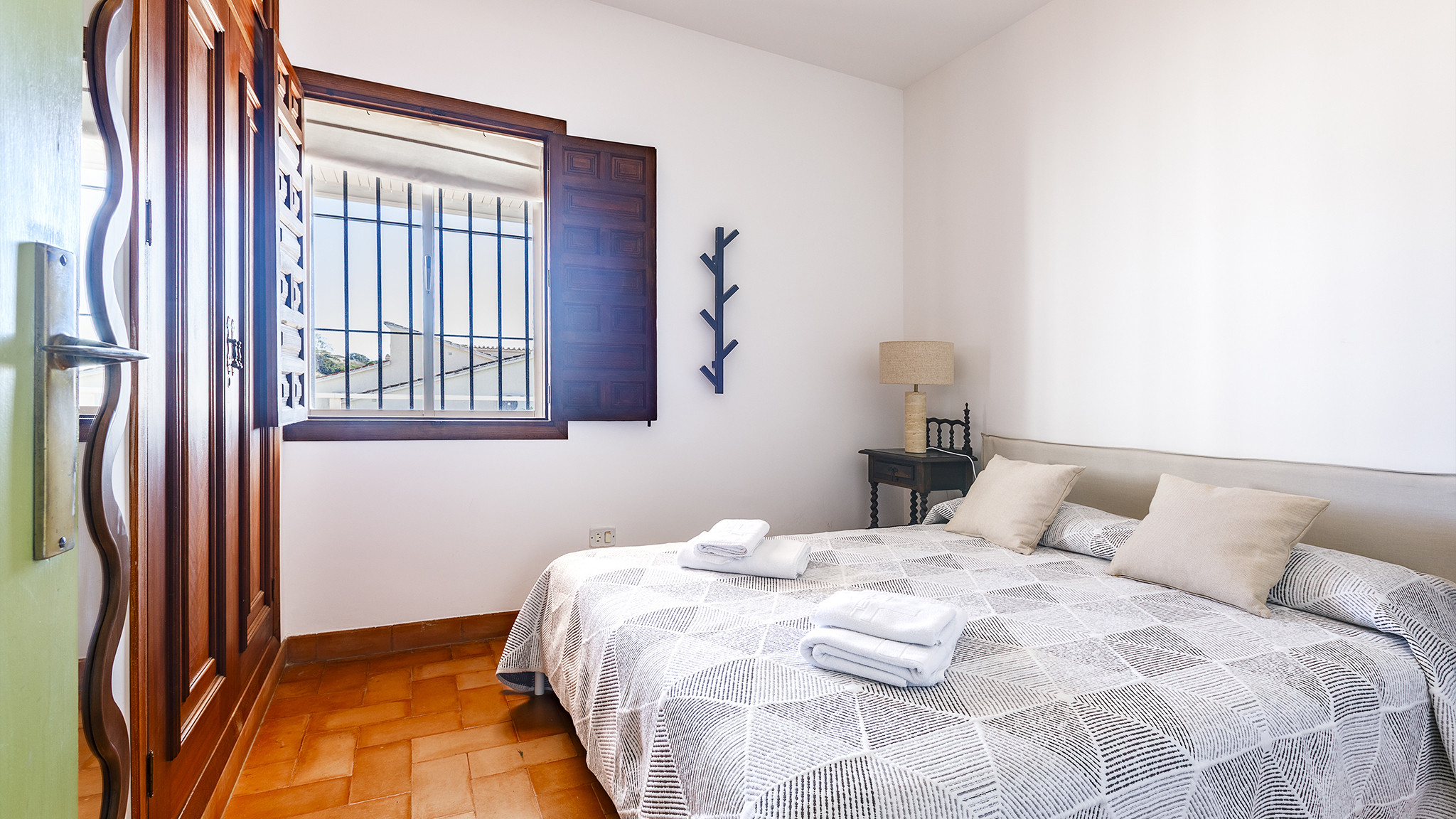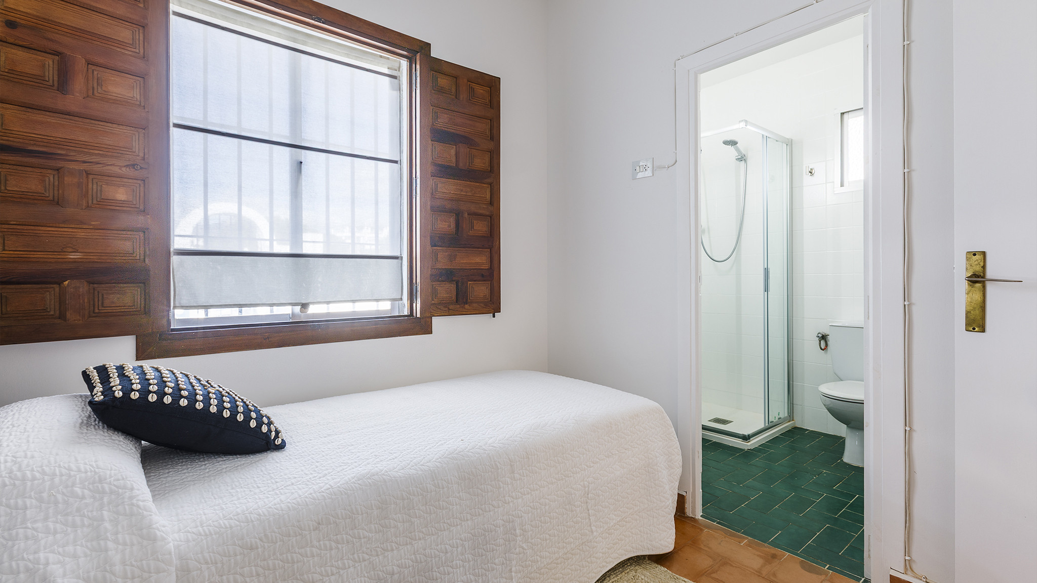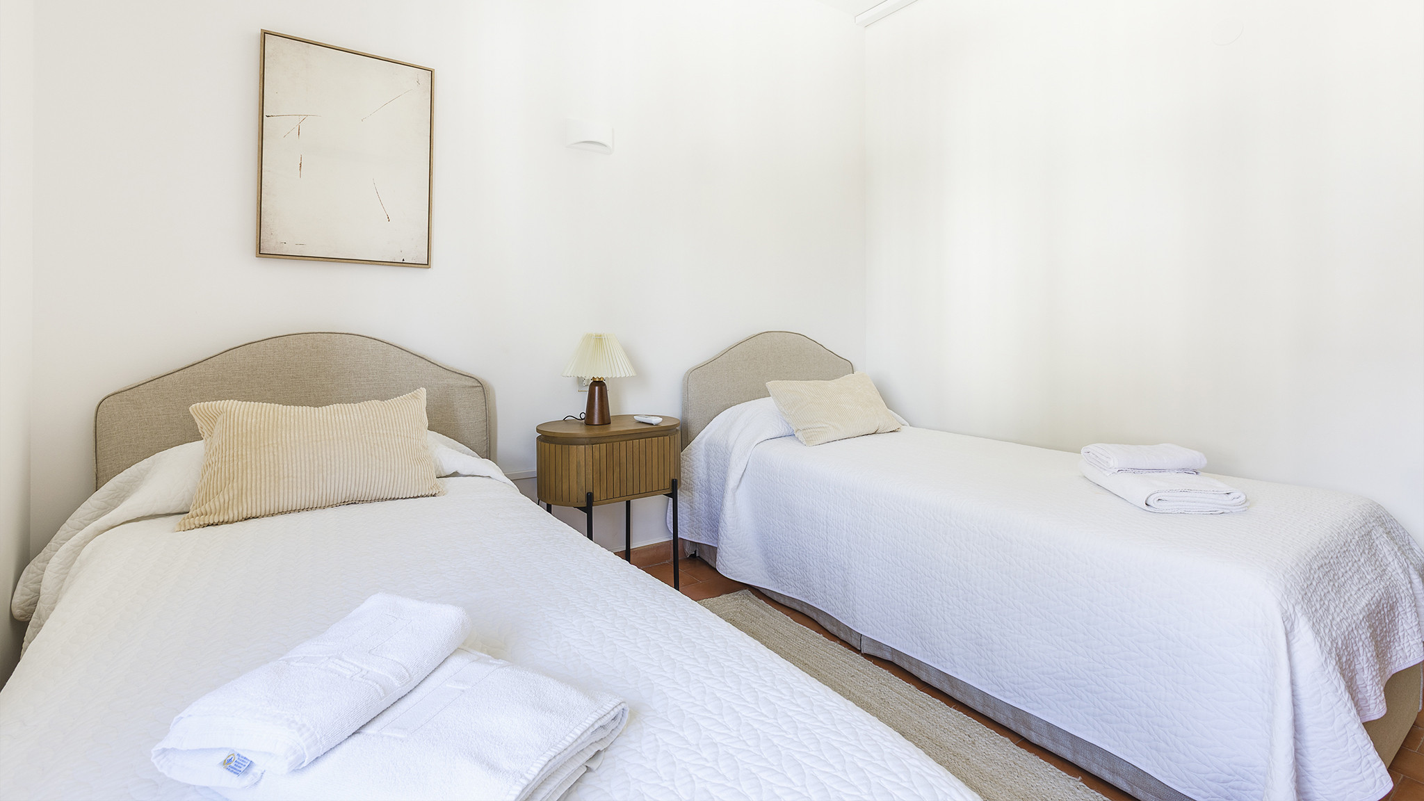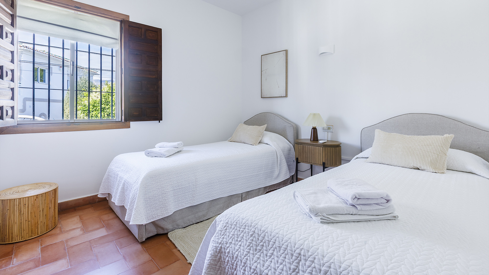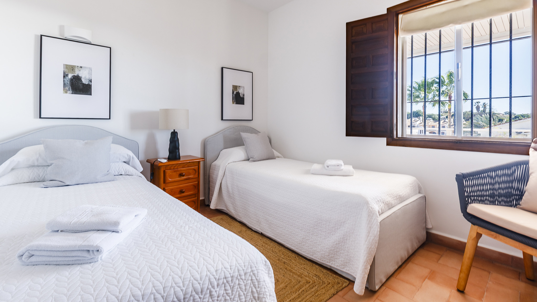 Das Einzelbettzimmer und eines der Doppelbettzimmer teilen sich eine nach Süden ausgerichtete Terrasse mit zwei Sitzgelegenheiten und Blick auf das Meer in der Ferne. Das andere Doppelbettzimmer hat eine eigene Terrasse.