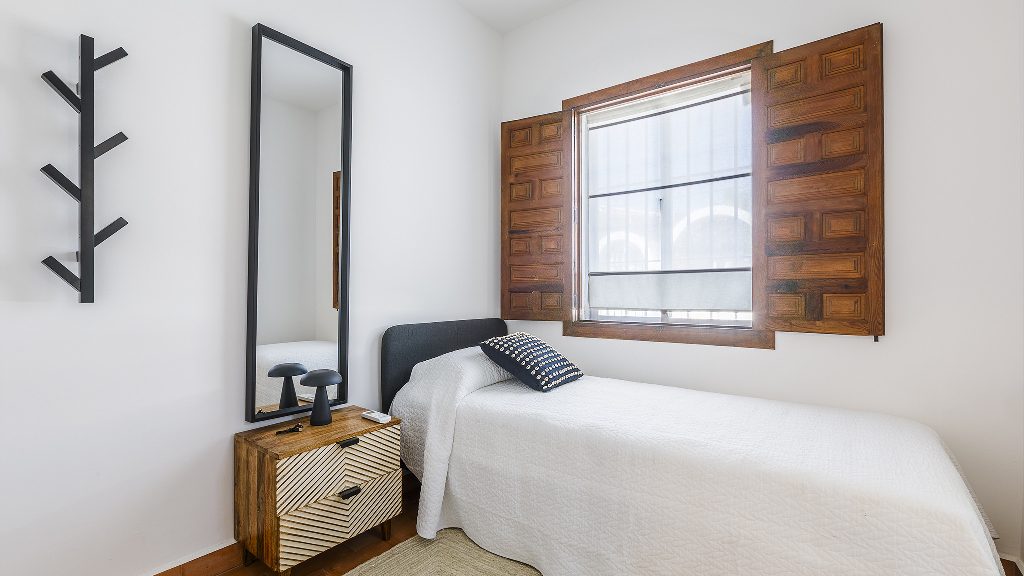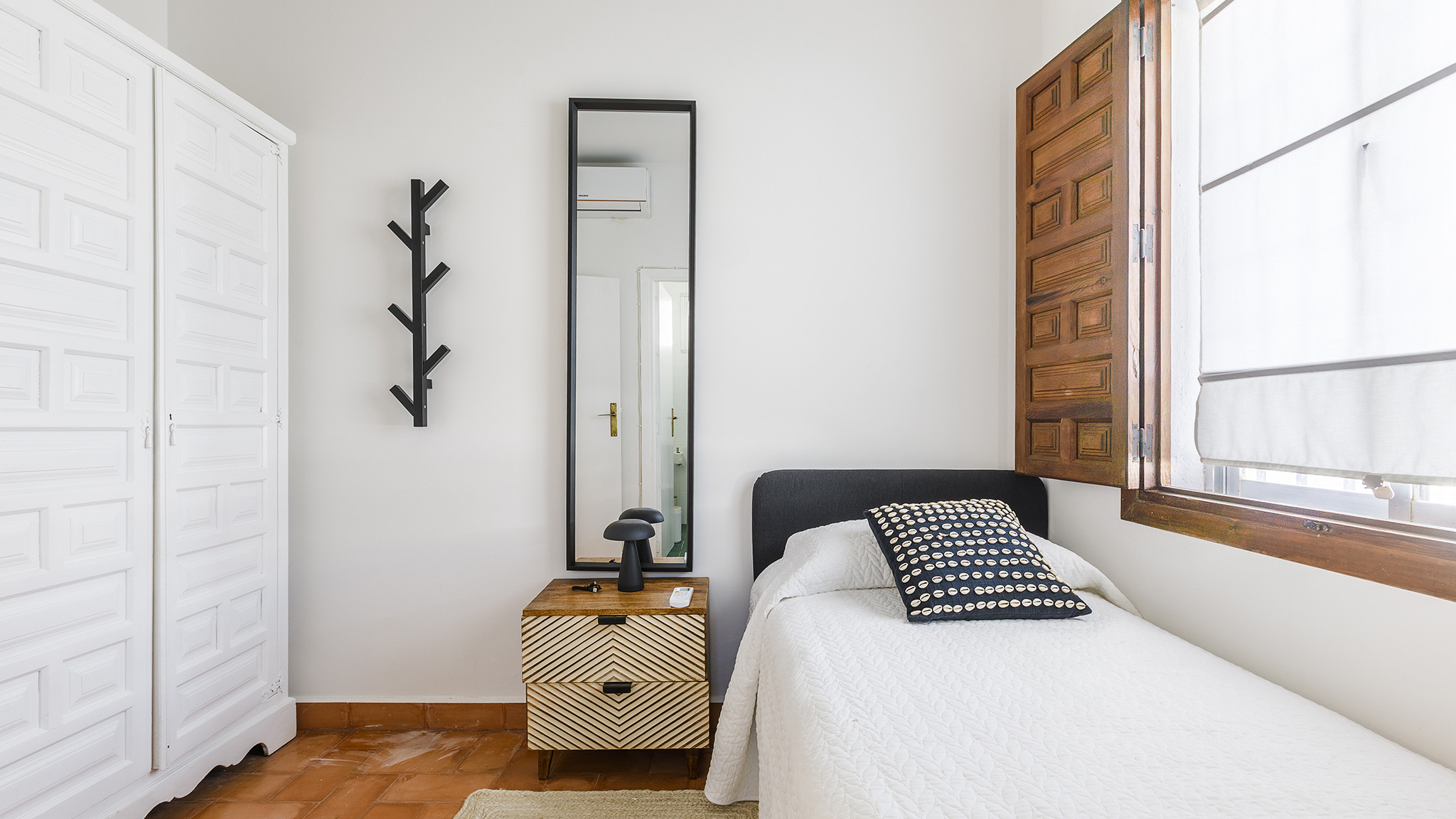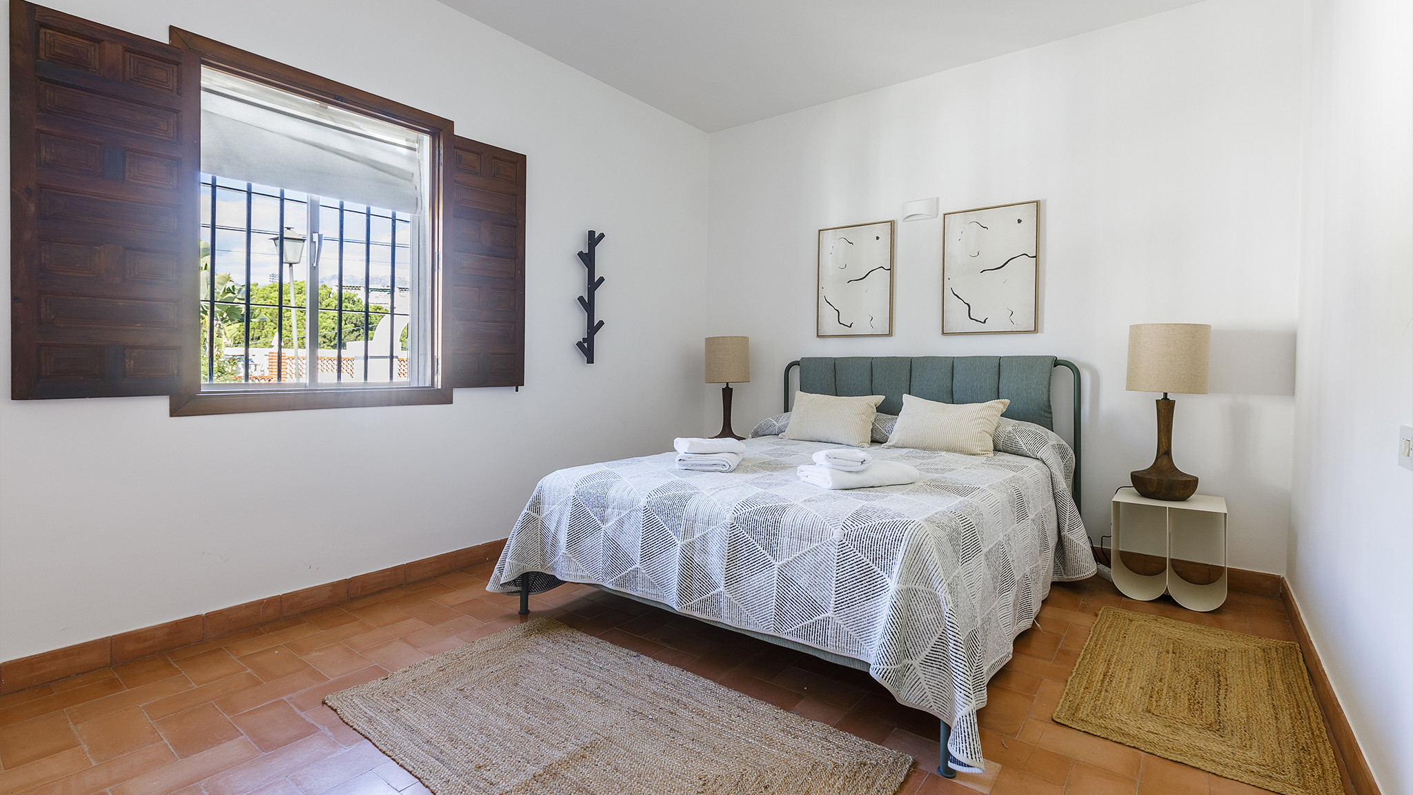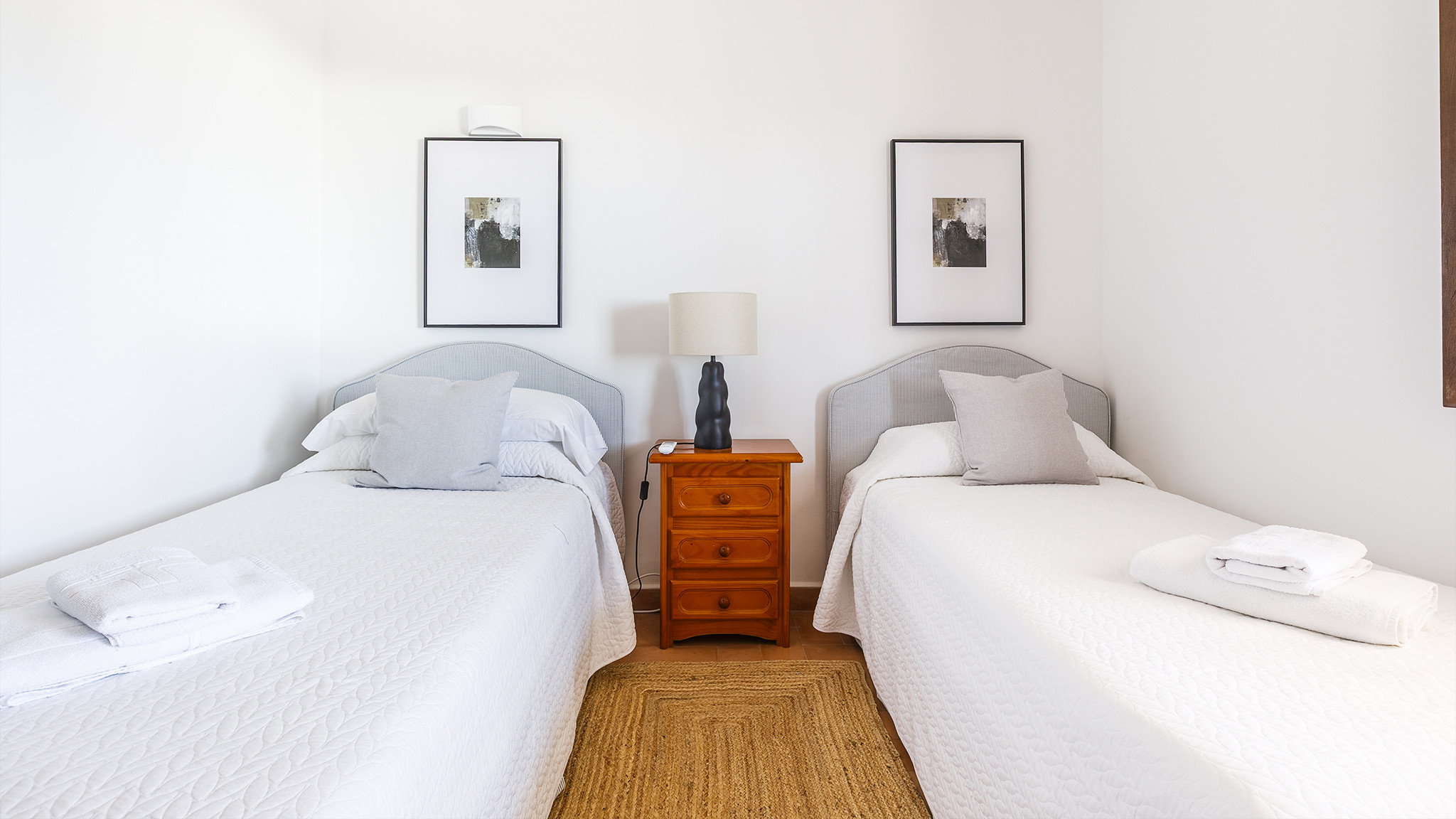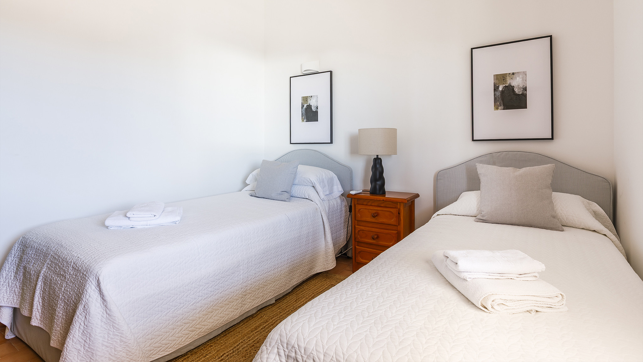 Das Einzelbettzimmer und eines der Doppelbettzimmer teilen sich eine nach Süden ausgerichtete Terrasse mit zwei Sitzgelegenheiten und Blick auf das Meer in der Ferne. Das andere Doppelbettzimmer hat eine eigene Terrasse.
