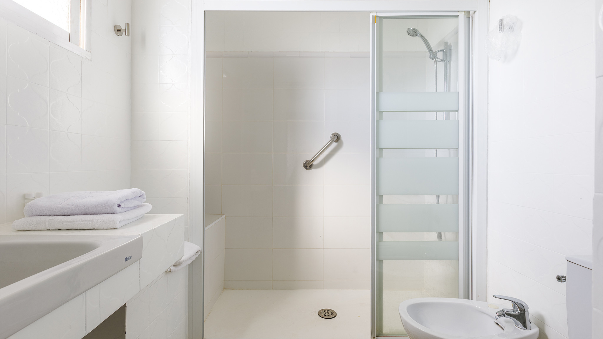 Auf der zweiten Etage erwartet Sie noch ein Doppelzimmer mit Badezimmer, ebenfalls mit Duschmöglichkeit über der Badewanne, Toilette, Waschbecken und Bidet.