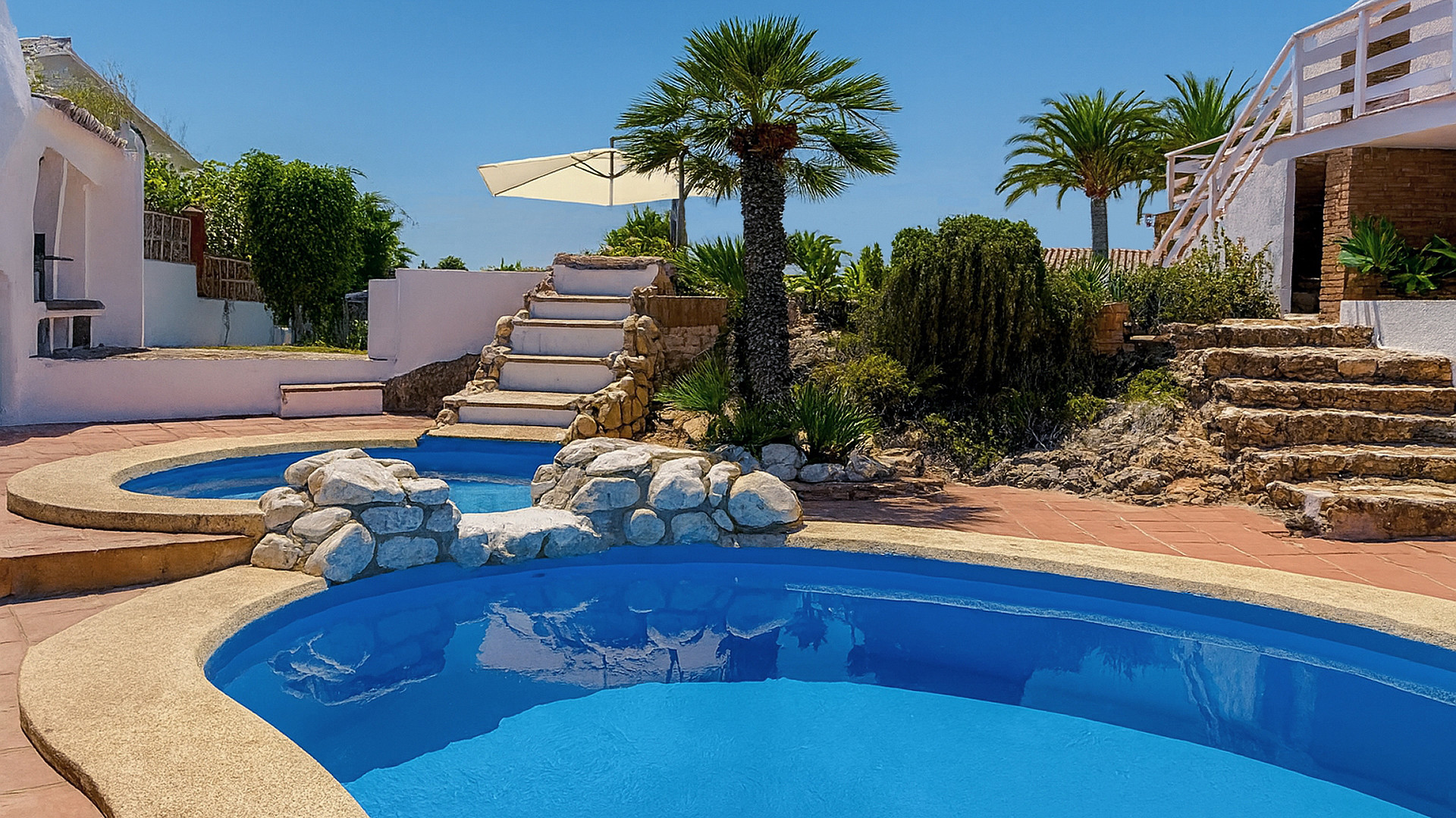 Der Außenbereich der Villa ist perfekt für Familien und das Leben im Freien. Der private Pool ist in ein kleines Kinderbecken und einen größeren Hauptpool unterteilt, umgeben von einer großzügigen Sonnenterrasse mit Liegestühlen. Ein Grillbereich und ein Rasen-Garten runden das Außengelände ab. Im ersten Stock bietet eine große Terrasse mit gemütlicher Sitzgelegenheit einen herrlichen Meerblick und ist mit einer Markise überdacht – ideal zum Entspannen zu jeder Tageszeit.