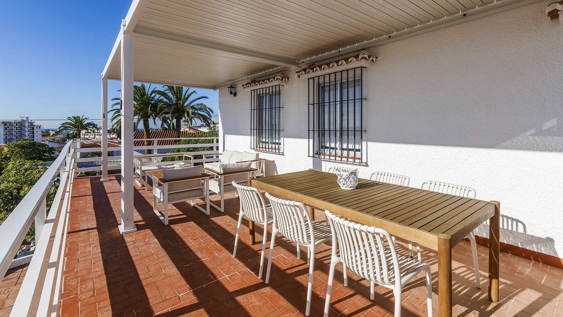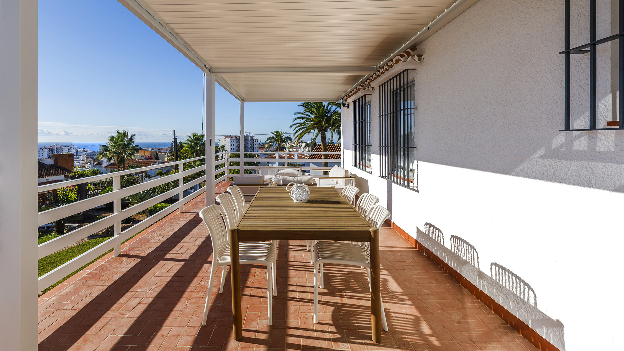 Wenn Sie auf der Suche sind nach einem Ferienhaus, das sich in Strand-, und zugleich Stadtnähe befindet, dann könnte dies hier vielleicht das passende Angebot sein: dieses komfortable Ferienhaus liegt im Viertel Exotica, 5 Autominuten vom Zentrum von Nerja und auch vom Strand entfernt. Es handelt sich um ein gut ausgestattetes und geräumiges Domizil, eine ausgezeichnete Möglichkeit für größere Familien oder einen Freundeskreis. Von der herrlichen, überdachten Terrasse auf der ersten Etage blicken Sie auf das Schwimmbecken, und es entfaltet sich vor Ihren Augen ein weiter Ausblick über die Landschaft der Umgebung und die Berge bis hin zur Küste.