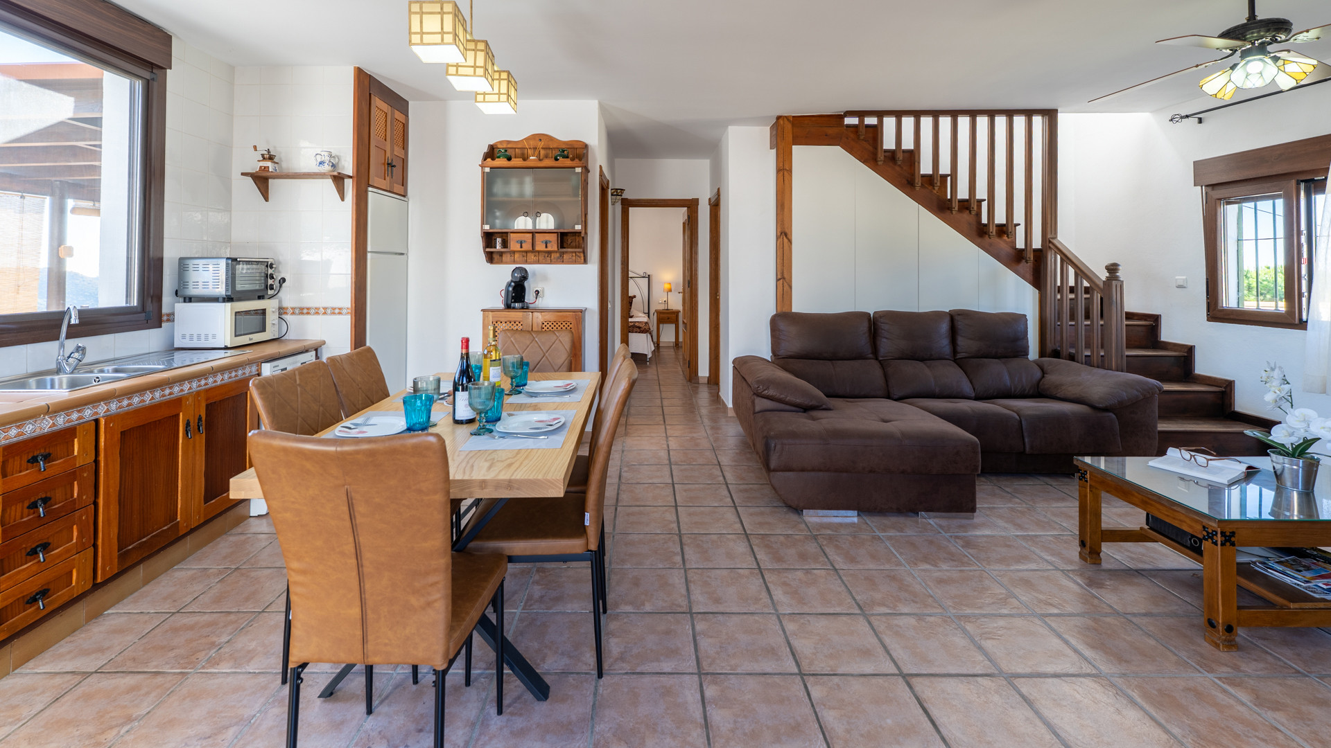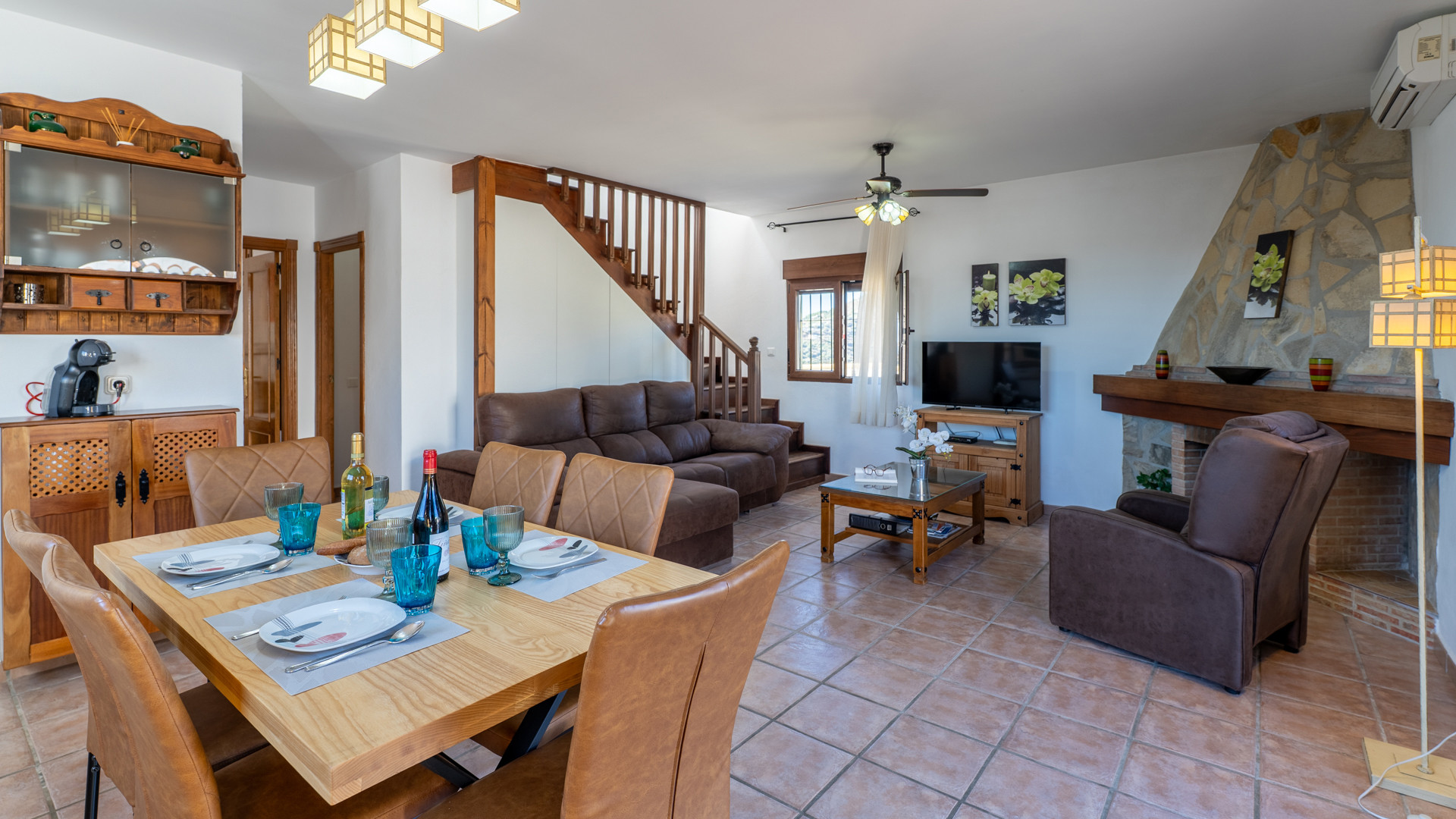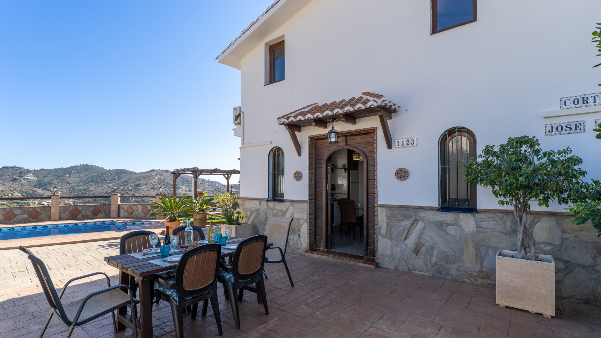 La casa es bonita, confortable y tranquila, en un entorno tranquilo, privilegiado y privado. En el exterior tiene un patio inmenso con una piscina muy grande, privada y tranquila para relajarse disfrutando de las vistas, cuatro mesas y sillas para sentarse, una barbacoa grande para cocinar y una fuente de piedra muy bonita en la pared. En el interior tiene una sala de estar y cocina abiertos, un cuarto de baño y pasillo pequeños y dos habitaciones con dos camas individuales cada una, y en la planta de arriba tiene una terraza grande con vistas a la sierra y la playa, y dentro tiene una suite con dos camas individuales y un cuarto de baño pequeño. Yo he estado con mis padres y mi hermano una semana entera y la verdad es que hemos estado tranquilos y privados, y lo hemos pasado muy bien, y el año que viene volveremos otra vez porque nos ha gustado mucho. El trato con los dueños Antonio y María ha sido muy bueno con nosotros.