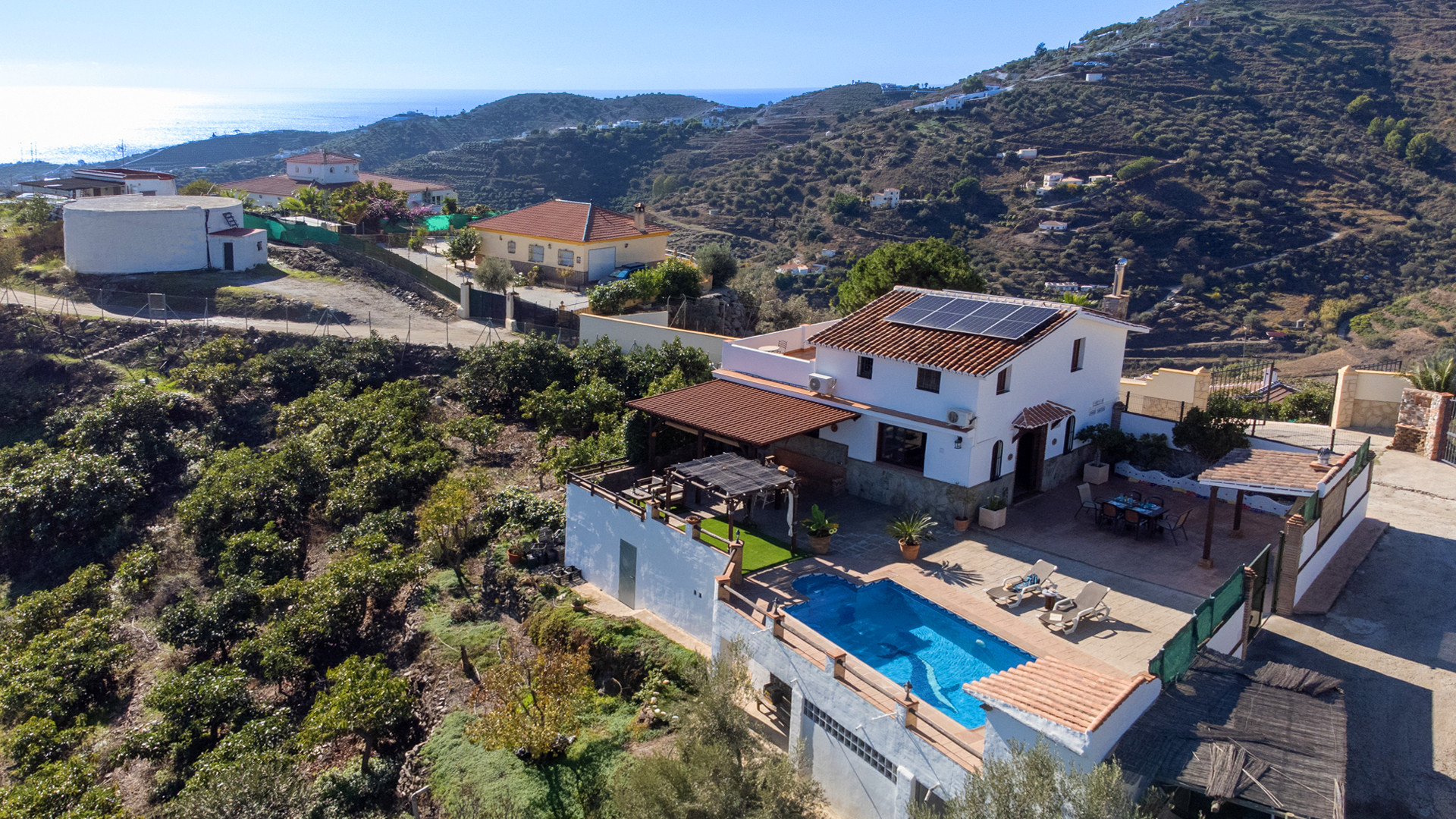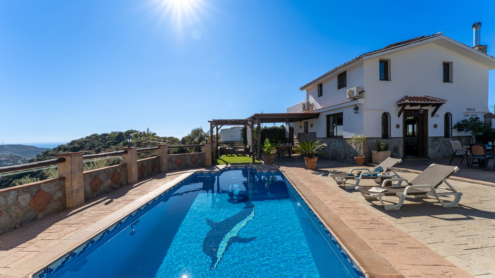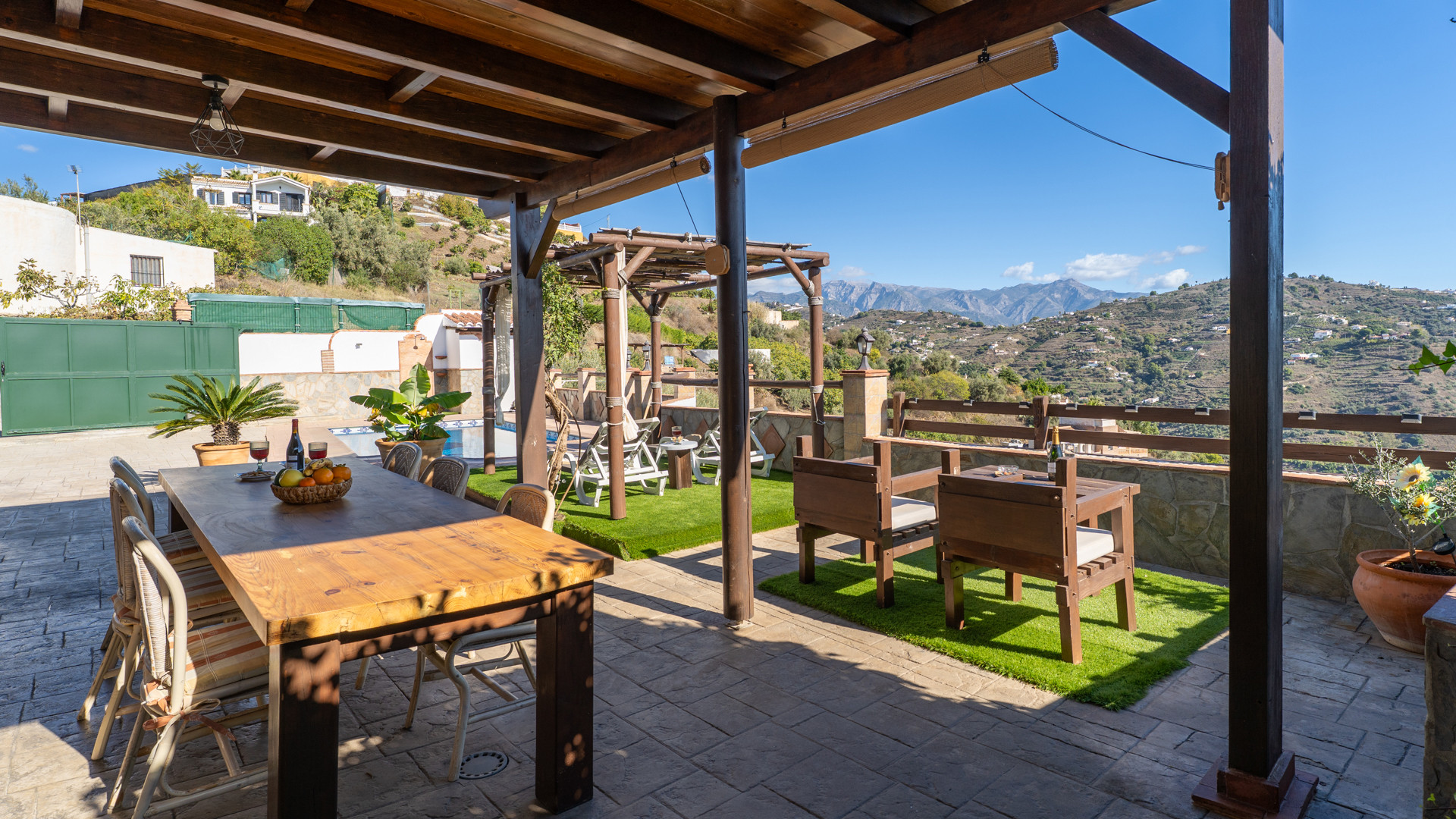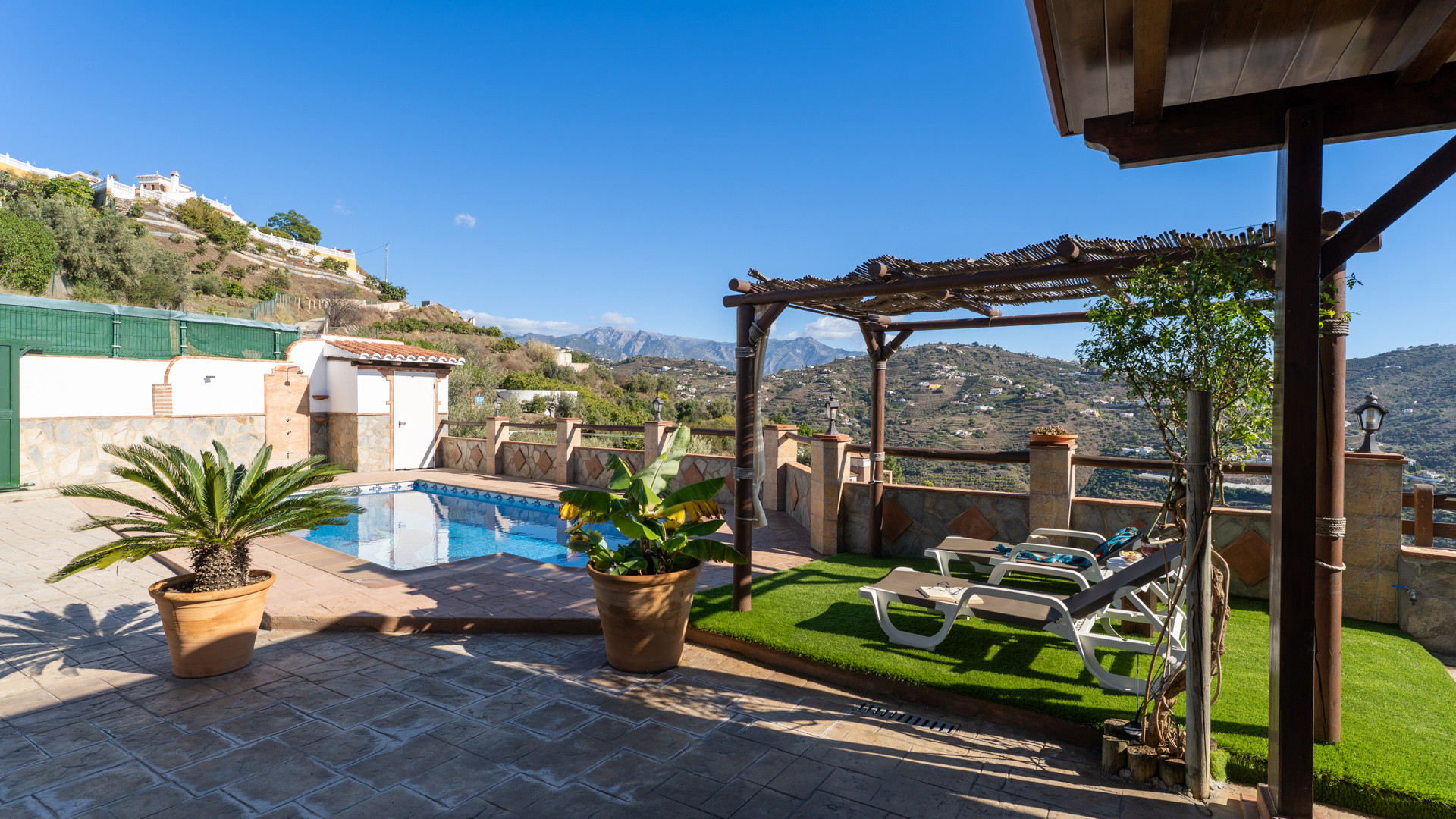 Dieses Ferienhaus hat eine Hanglage und ist 1,5 km von Torrox und 6 km von den Stränden und dem pulsierenden Leben der Torrox-Küste entfernt. Man erreicht es über einen ansteigenden betonierten Weg, der auf den letzten 400 Metern in einen Landweg in relativ gutem Zustand übergeht. Die geräumigen Terrassen sind sichtgeschützt und haben einen 8 x 4 Meter großen Swimmingpool. Dieser kann nachts beleuchtet werden, falls Sie unter dem romantischen Sternenhimmel schwimmen möchten. Neben dem Pool gibt es einen Geräteraum mit WC und Waschmaschine. Für Mahlzeiten an der frischen Luft empfehlen wir die überdachte Veranda, die mit einem hübschen Holztisch ausgestattet ist. Ein gemauerter Grill, Terrassenmöbel und Sonnenbetten sind vorhanden. Ein Pingpong-Tisch erweitert die Freizeitgestaltungsmöglichkeiten. Sollten Sie diesen hübschen Ort wirklich einmal verlassen wollen, dann machen Sie einen Tagesausflug nach Granada und lassen Sie den Zauber der Alhambra auf sich wirken. Das Haus hat einen eigenen Parkplatz.