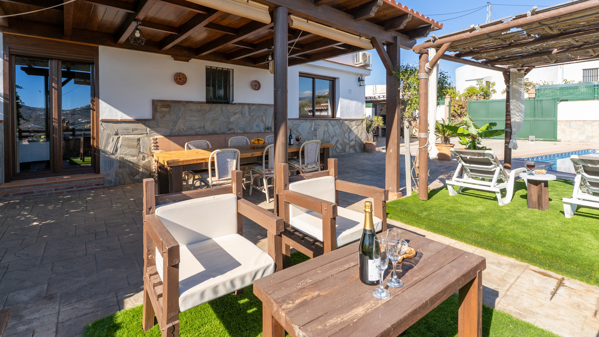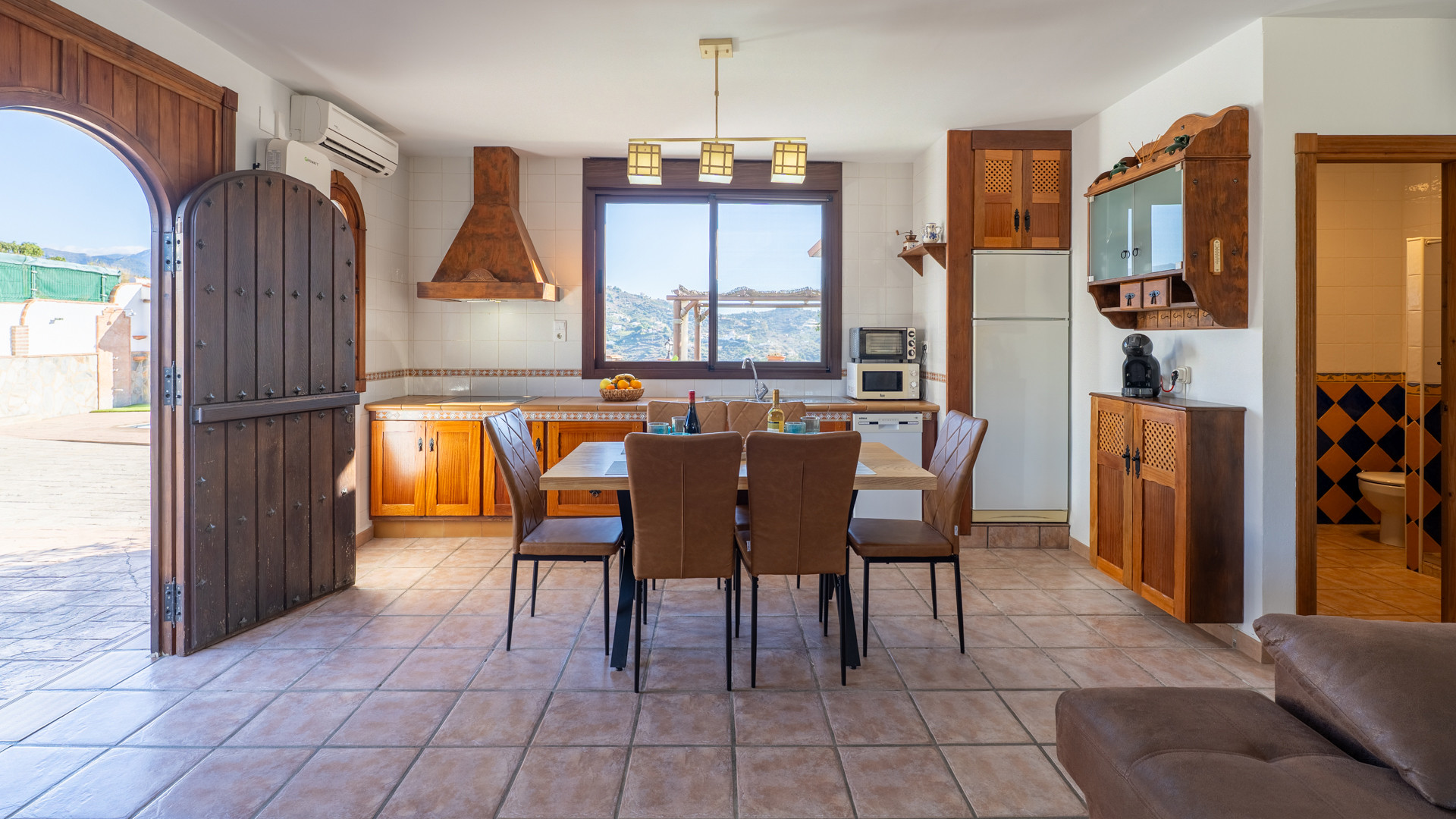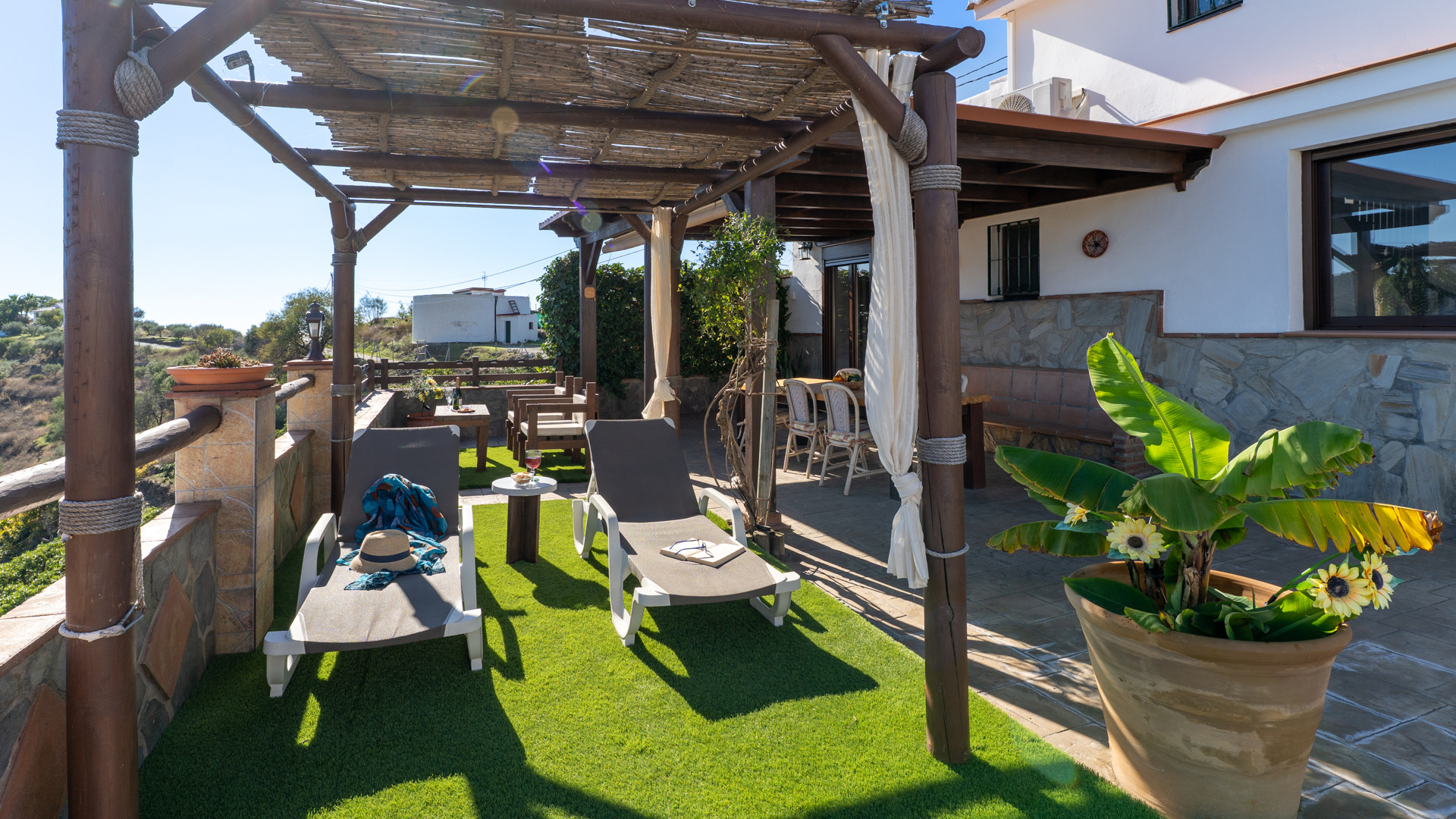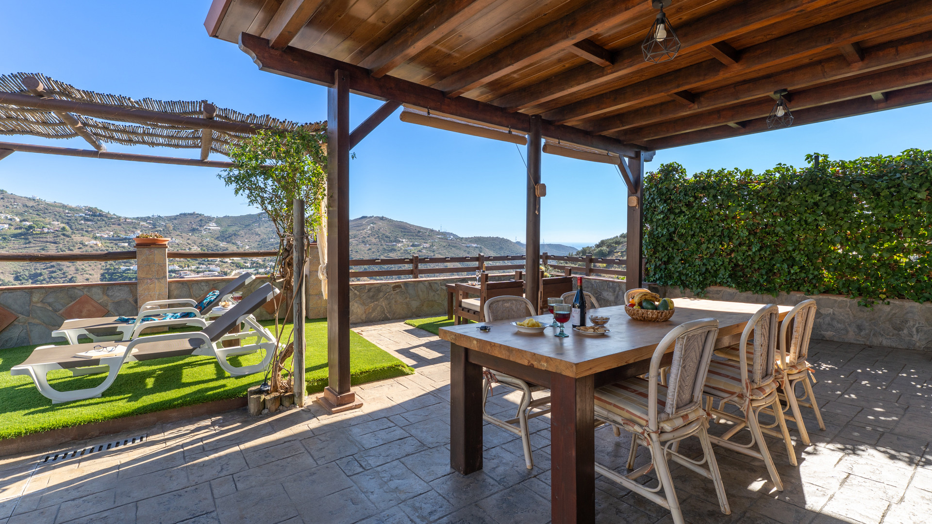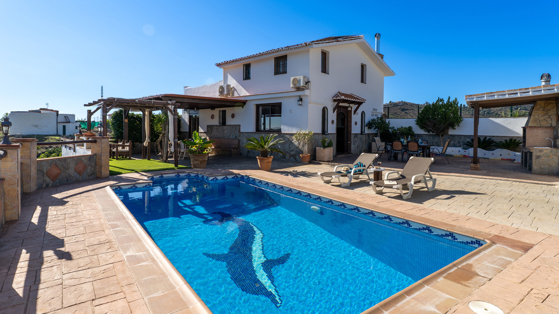 Dieses Ferienhaus hat eine Hanglage und ist 1,5 km von Torrox und 6 km von den Stränden und dem pulsierenden Leben der Torrox-Küste entfernt. Man erreicht es über einen ansteigenden betonierten Weg, der auf den letzten 400 Metern in einen Landweg in relativ gutem Zustand übergeht. Die geräumigen Terrassen sind sichtgeschützt und haben einen 8 x 4 Meter großen Swimmingpool. Dieser kann nachts beleuchtet werden, falls Sie unter dem romantischen Sternenhimmel schwimmen möchten. Neben dem Pool gibt es einen Geräteraum mit WC und Waschmaschine. Für Mahlzeiten an der frischen Luft empfehlen wir die überdachte Veranda, die mit einem hübschen Holztisch ausgestattet ist. Ein gemauerter Grill, Terrassenmöbel und Sonnenbetten sind vorhanden. Ein Pingpong-Tisch erweitert die Freizeitgestaltungsmöglichkeiten. Sollten Sie diesen hübschen Ort wirklich einmal verlassen wollen, dann machen Sie einen Tagesausflug nach Granada und lassen Sie den Zauber der Alhambra auf sich wirken. Das Haus hat einen eigenen Parkplatz.
