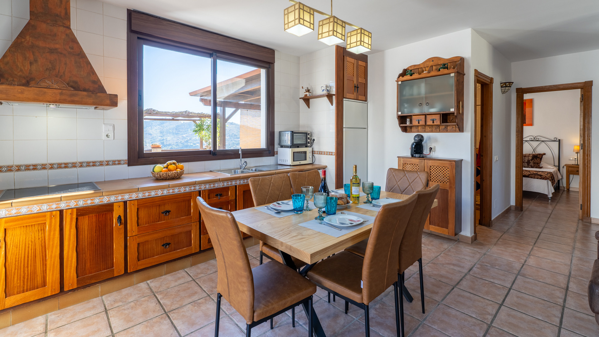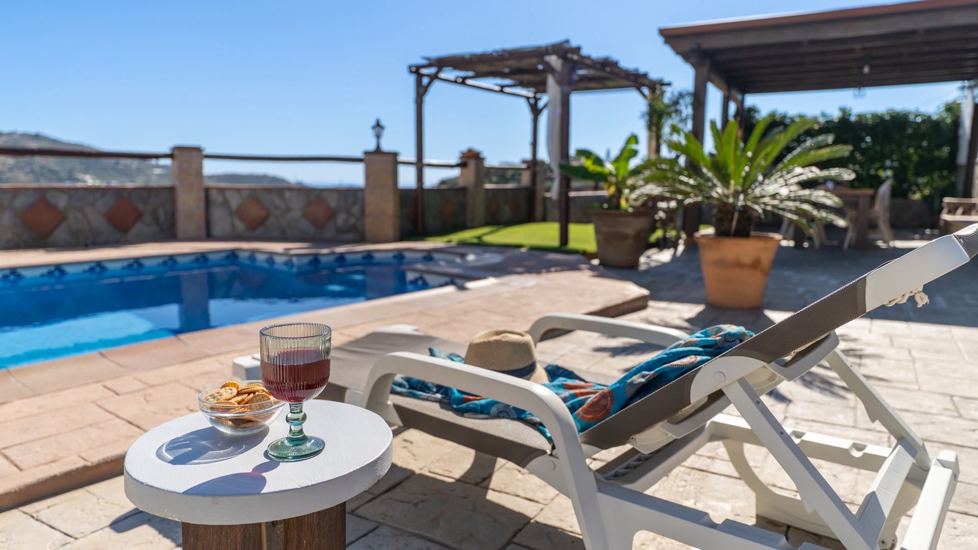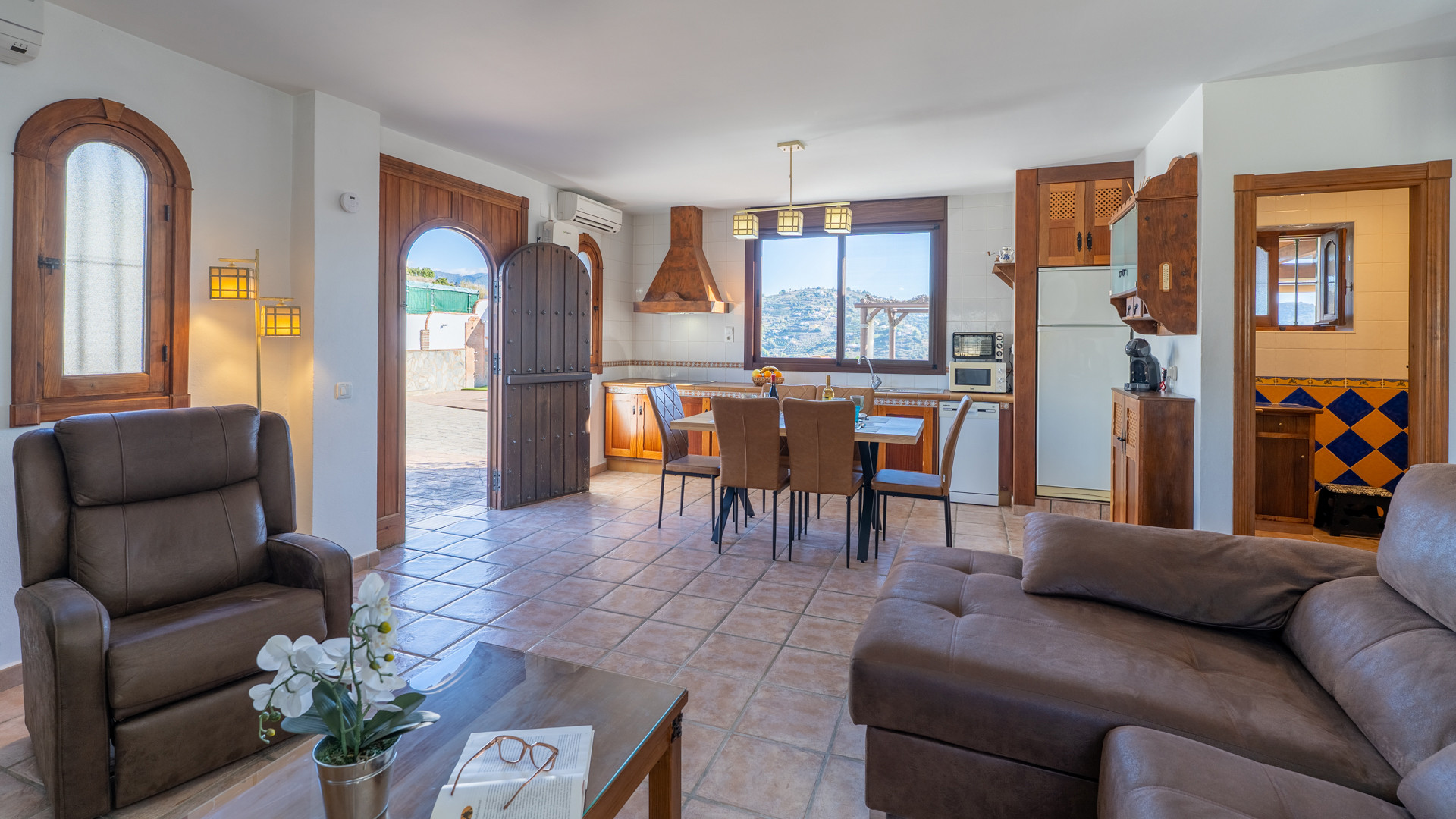 Dank seiner Lage auf einem Hügel hat dieses Haus einen wunderbaren Blick auf die umliegende Landschaft mit ihren Olivenhainen und Avocado-Plantagen. Seine geräumigen Terrassen bieten Sonne, aber auch Schatten. Es gibt einen Pool- und einen Grillbereich. Eine komfortable Einrichtung und farbenfrohe rustikale Dekoration machen aus ihm ein charmantes Refugium.