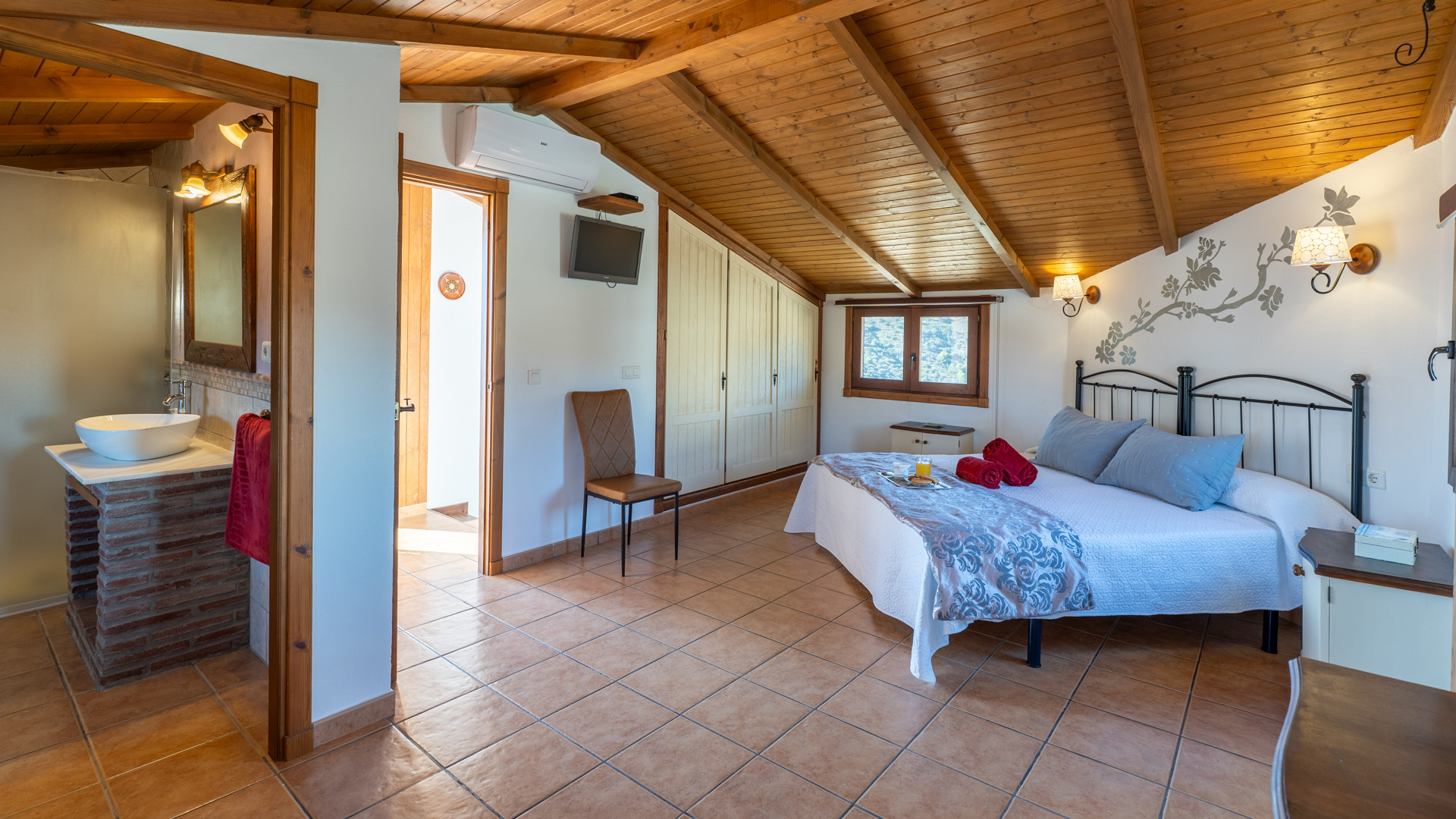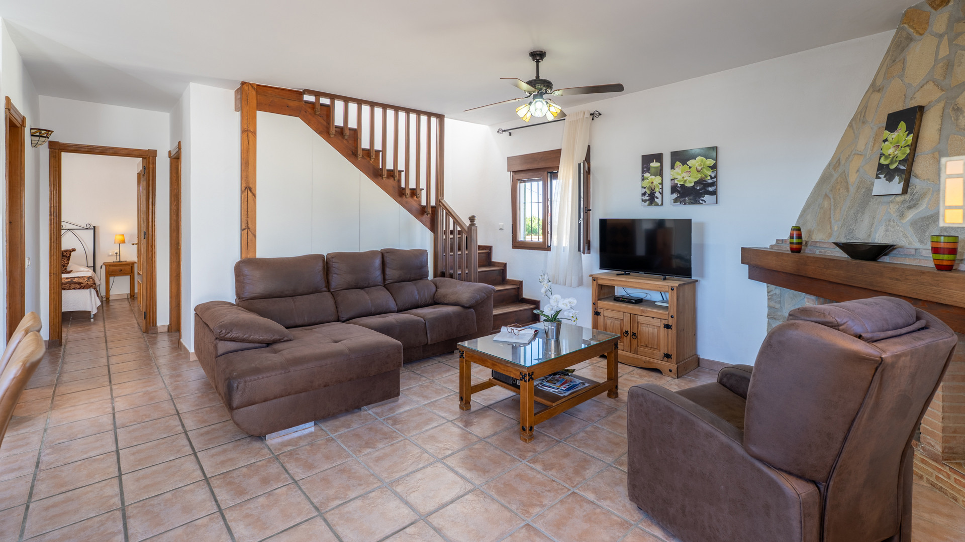 Die Räume sind auf 2 Etagen verteilt. Sie sind farbenfroh und rustikal eingerichtet. Das Wohn-/Esszimmer hat einen offenen Kamin, einen Esstisch für 6 Personen, ein Sofa, 2 Sessel und Satelliten-TV. Die offene Küche ist mit Cerankochfeld, Backofen, Mikrowelle, Geschirrspüler und Kühlschrank mit Gefrierfach ausgestattet. Die Waschmaschine befindet sich in einem Geräteraum. Das hübsch eingerichtete und geräumige Hauptschlafzimmer hat ein Doppelbett und ein Ensuite-Badezimmer mit Duschbadewanne, WC und Waschbecken. Die anderen beiden Schlafzimmer haben jeweils zwei Einzelbetten und teilen sich einen Duschraum mit WC und Waschbecken.